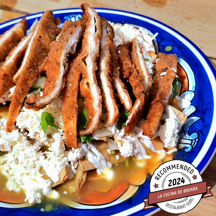 bañados mitad salsa verde y mitad salsa roja con crema, queso cebolla y cilantro picados y pechuga empanizada