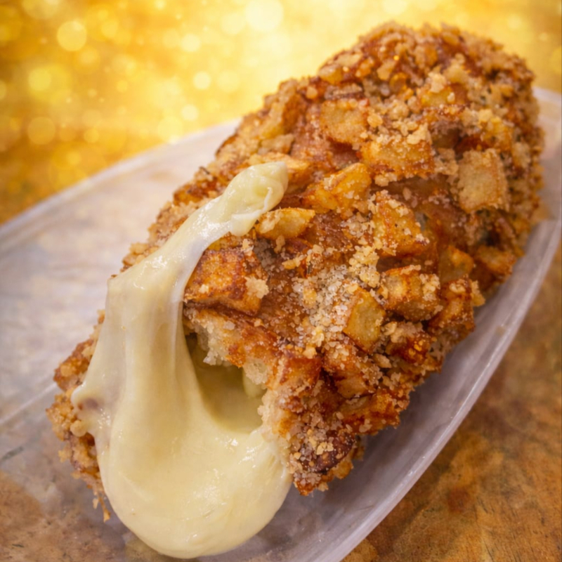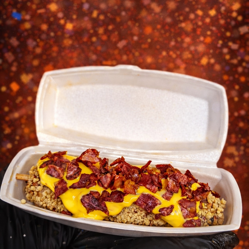 DELICIOSA BANDERILLA RELLENA DE SALCHICHA CUBIERTA DE PANKO, BAÑADA EN QUESO CON QUESO DERRETIDO Y TROZOS DE TOCINO