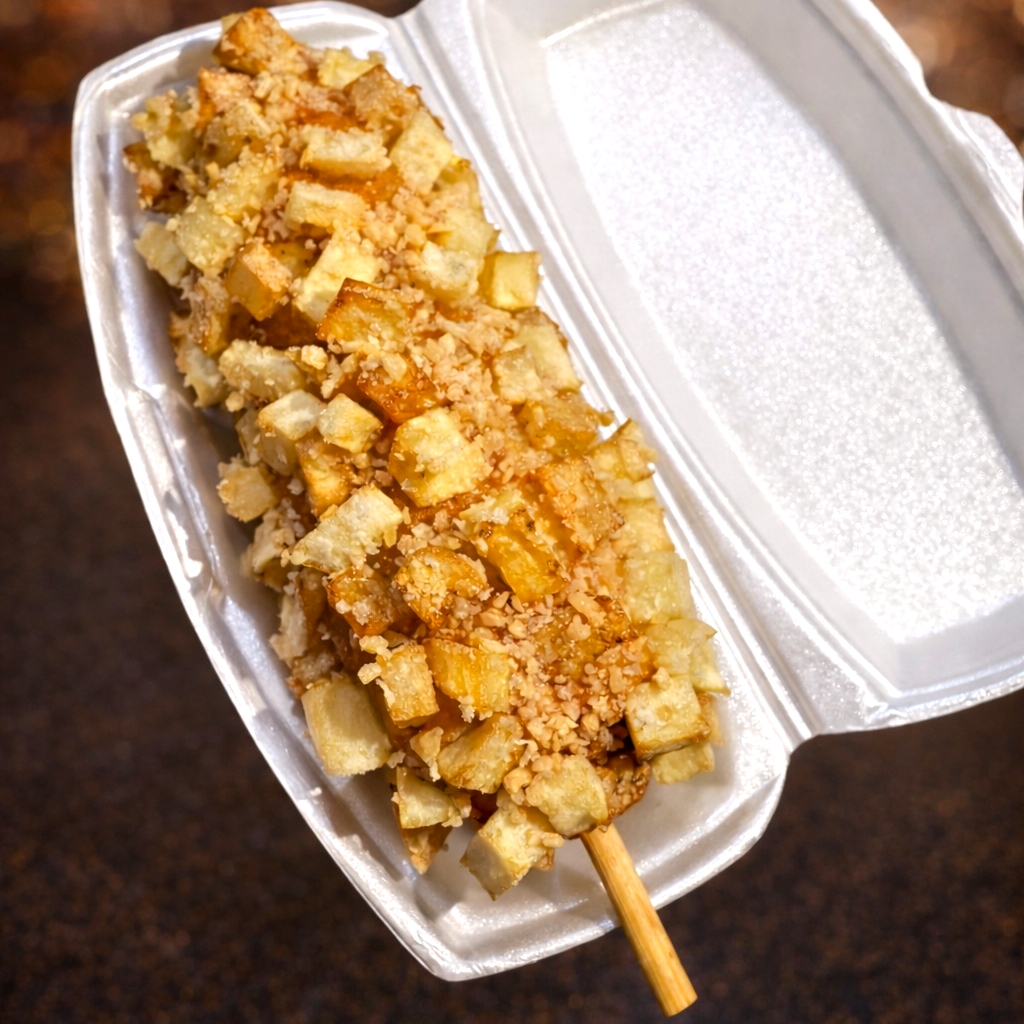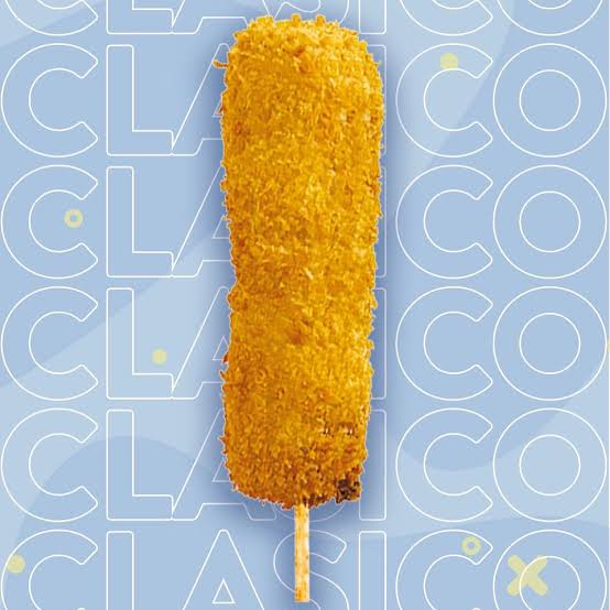 DELICIOSA BANDERILLA RELLENA DE MITAD QUESO MOZZARELLA Y MITAD SALCHICHA CUBIERTA DE CUBITOS DE PAPA