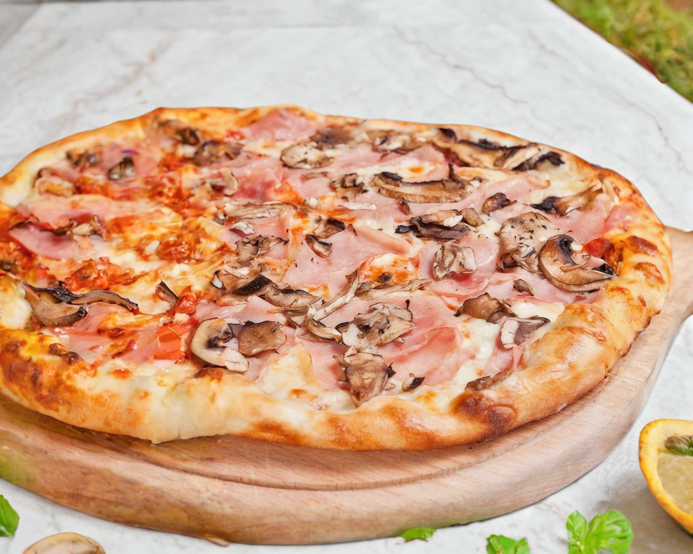CHAMPIÑONES,JAMON,QUESO MOZZARELLA,SALSA DE TOMATE,BASE DE PIZZA CASERA