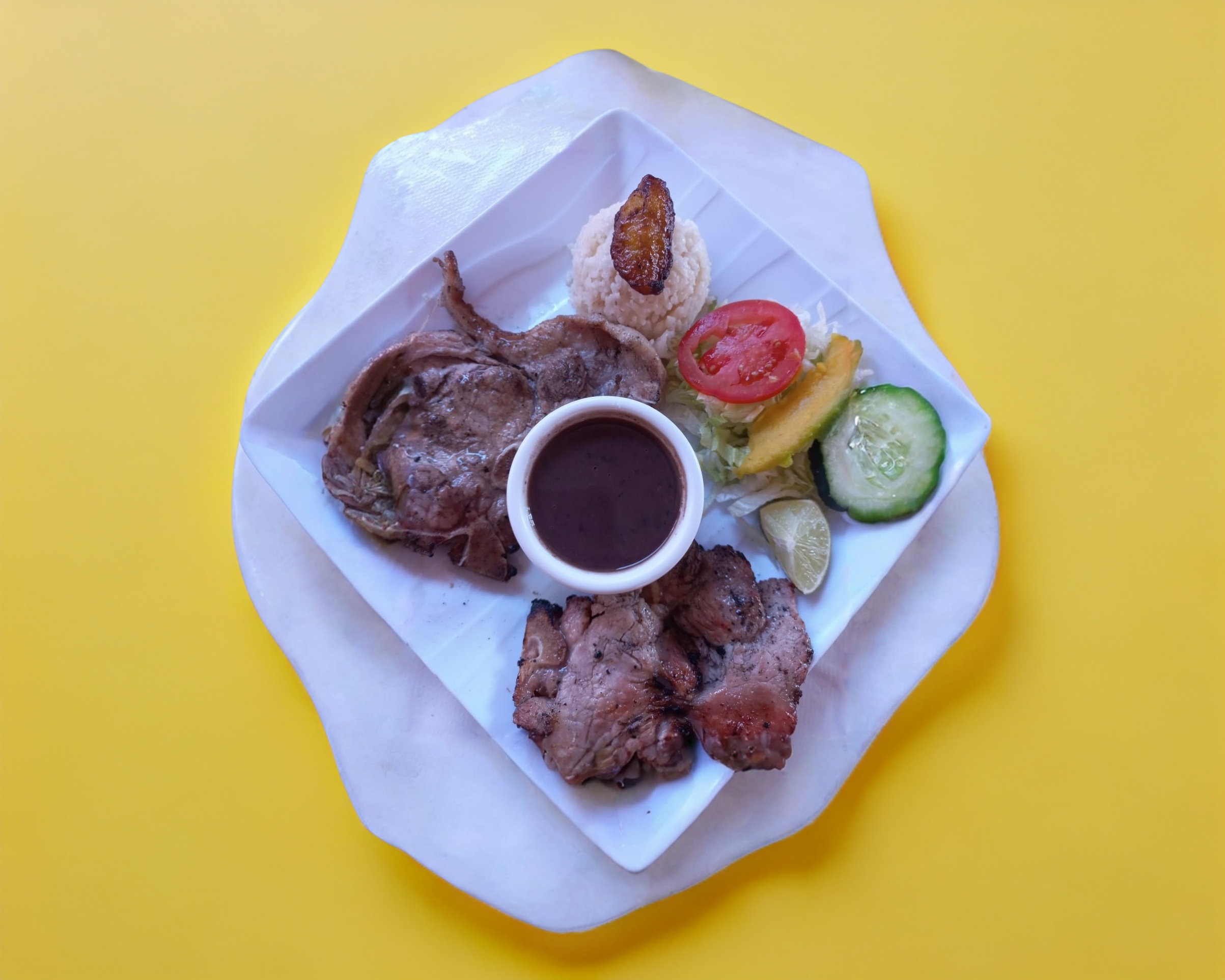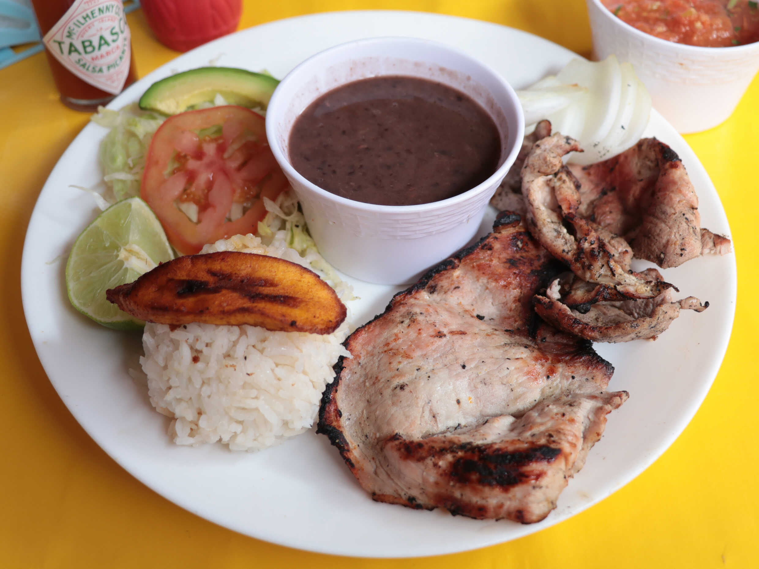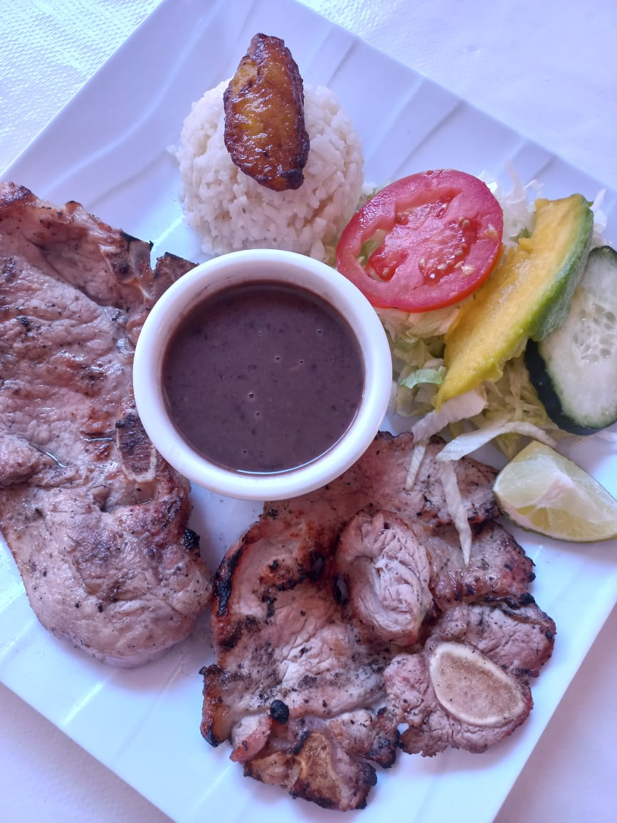 Bistec de cerdo al mojo de ajo, acompañado de ensalada, arroz y frijoles, salsa y tortillas.