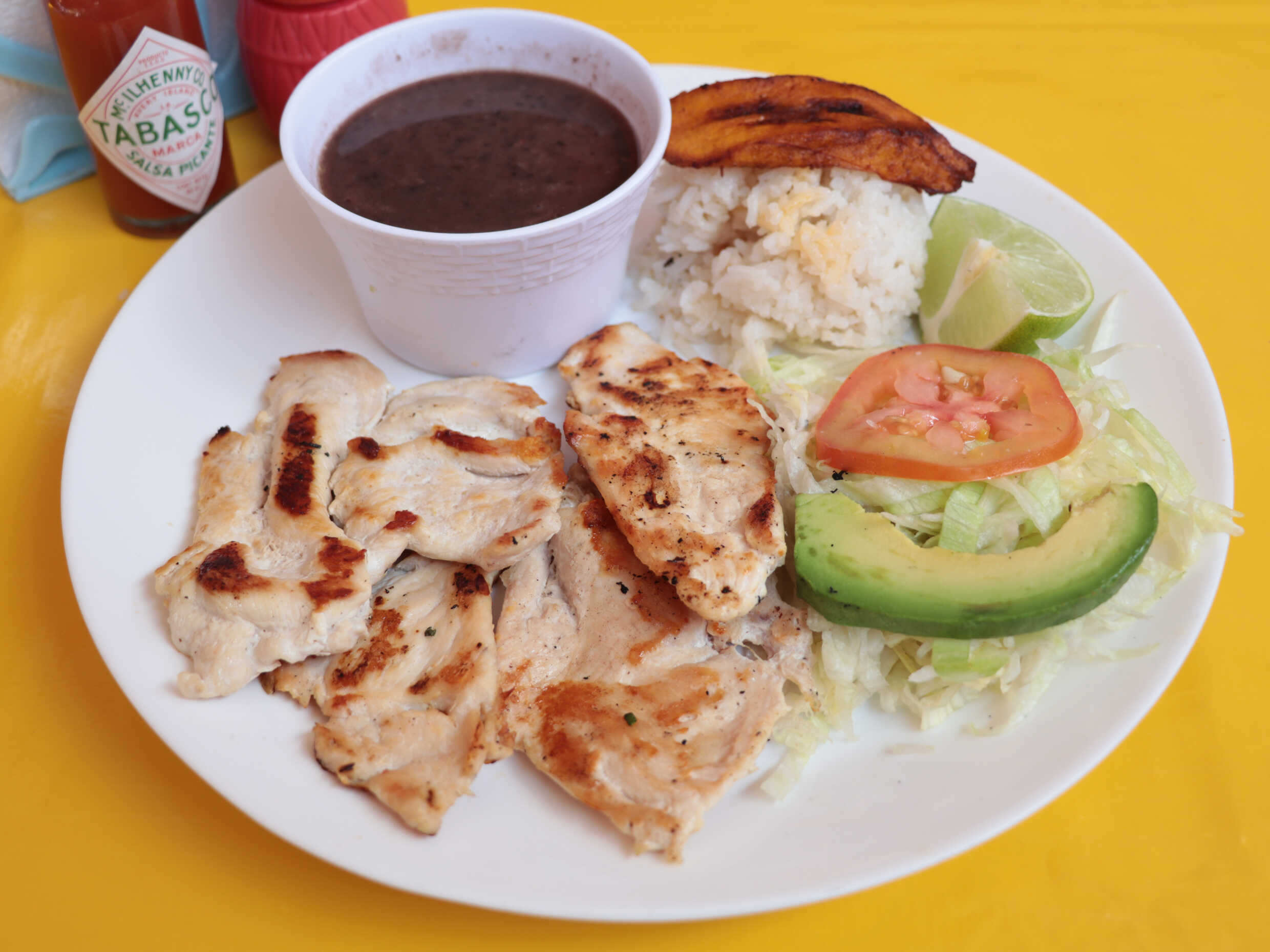 Rica pechuga de pollo a la plancha, acompañada de ensalada, arroz, a elegir frijoles o papas, tortillas y salsa.