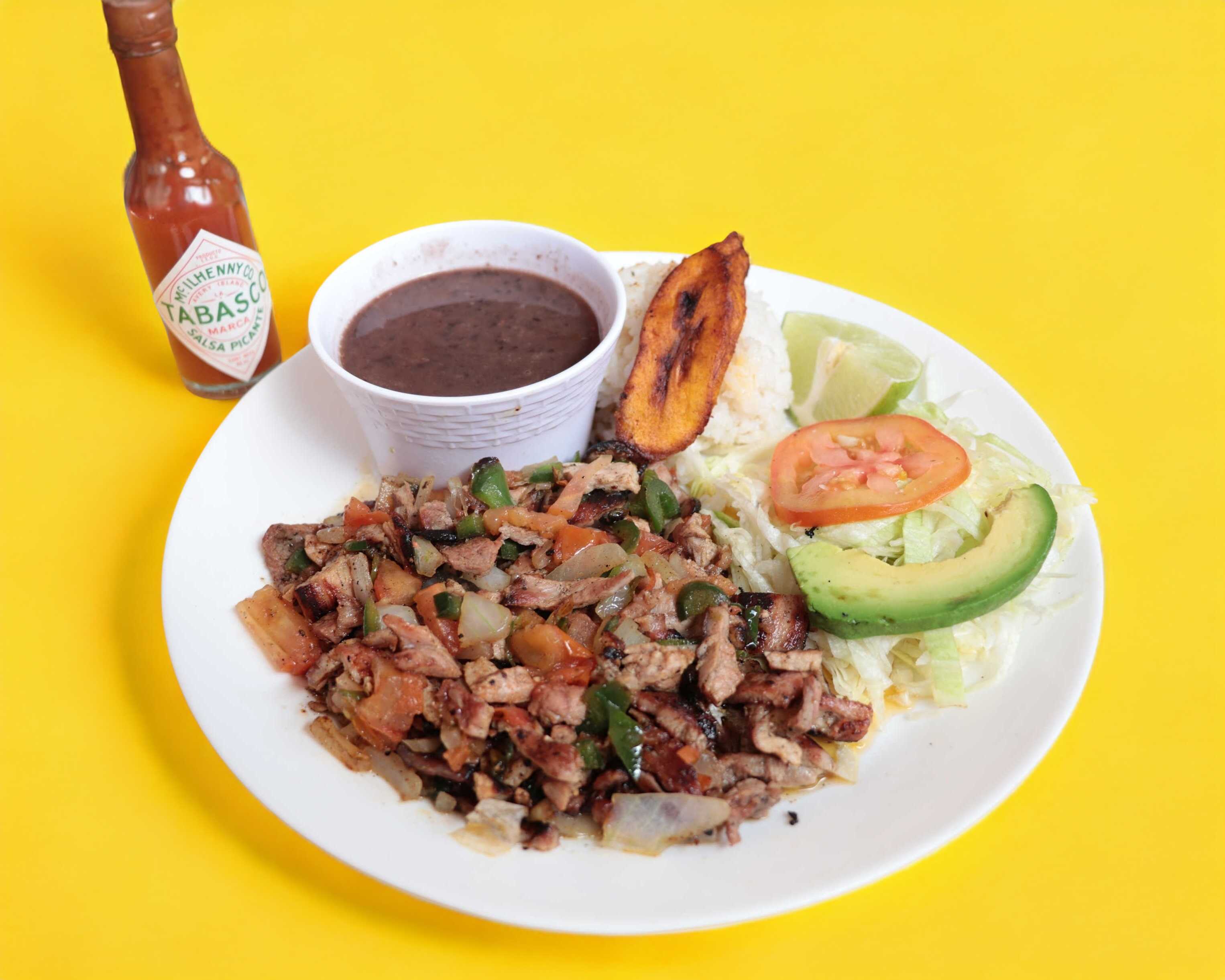Bistec de puerco preparado con cebolla, chile poblano y tomate, acompañado de ensalada, arroz, frijoles, salsa y tortillas.