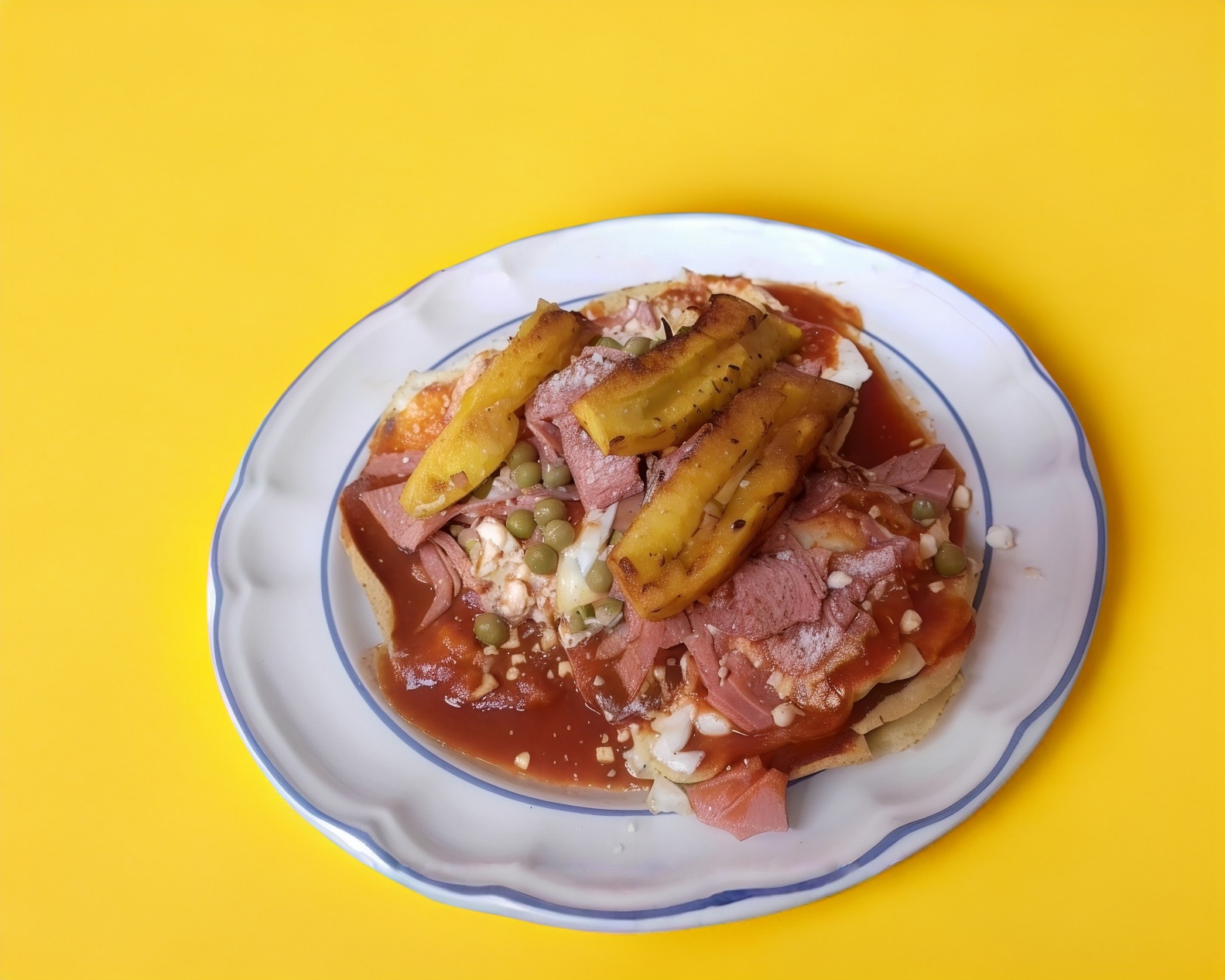 Base de tostadas, frijoles refritos, huevo balado de salsa de tomate, plátano macho, jamón, queso sopero y chicharos (3 piezas).