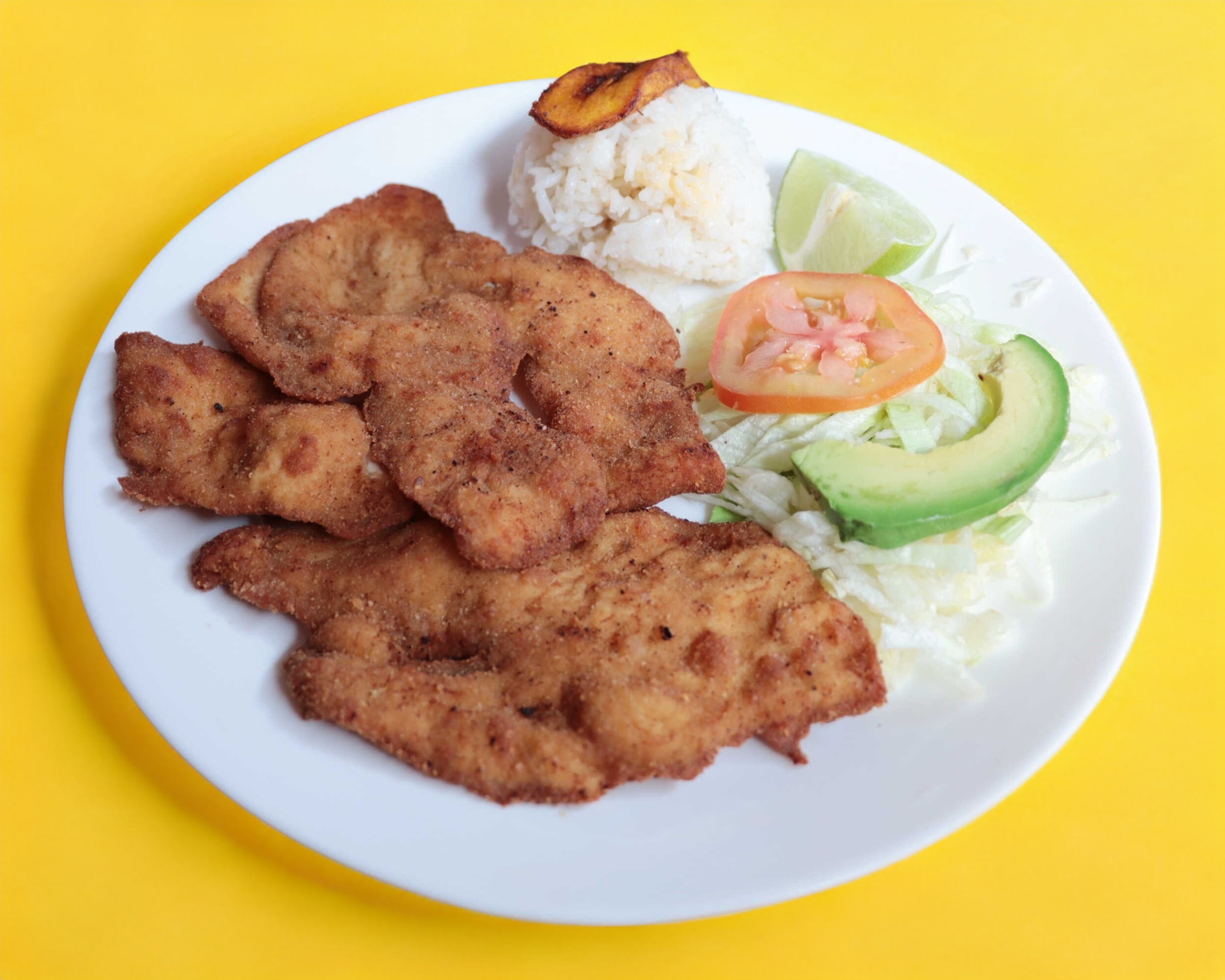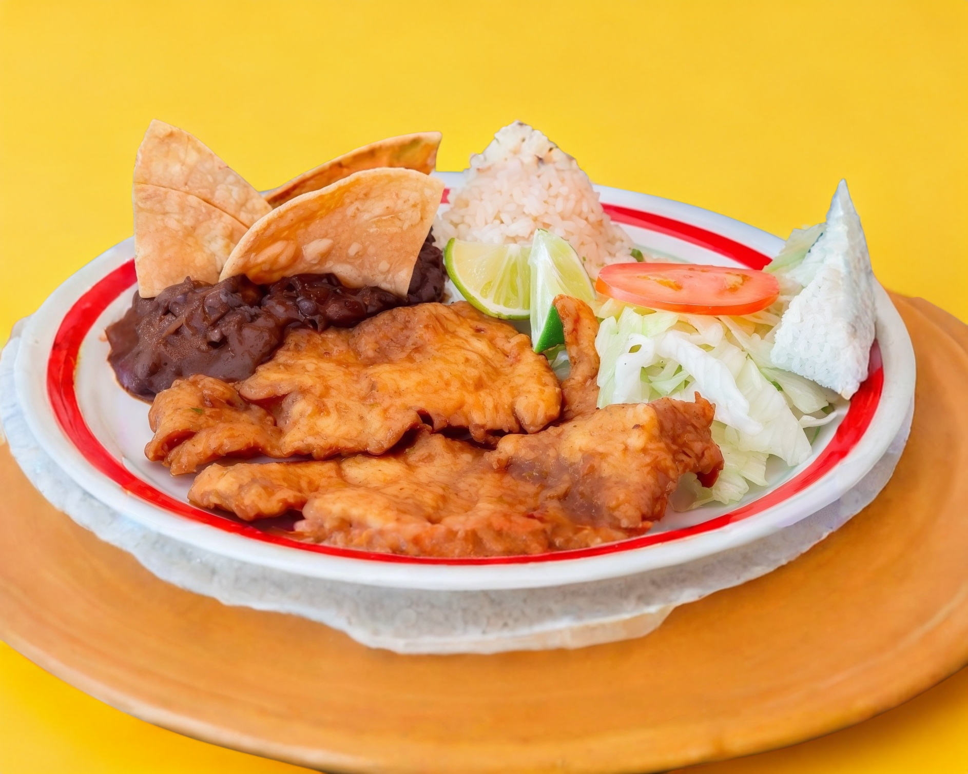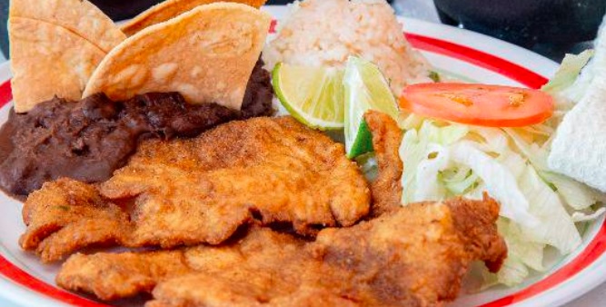 Bistec de res empanizado, acompañado de ensalada, arroz, salsa, tortillas y a escoger frijoles o papas fritas.