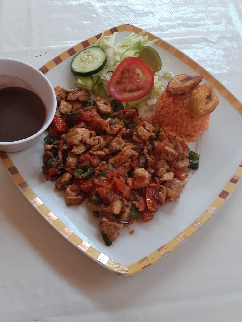 Pollo preparado con cebolla, chile poblano y tomate, acompañado de ensalada, arroz, frijoles, salsa y tortillas.