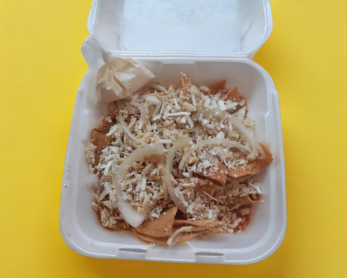 Totopos bañados en salsa de tomate con 2 huevos, cebolla, queso y crema.