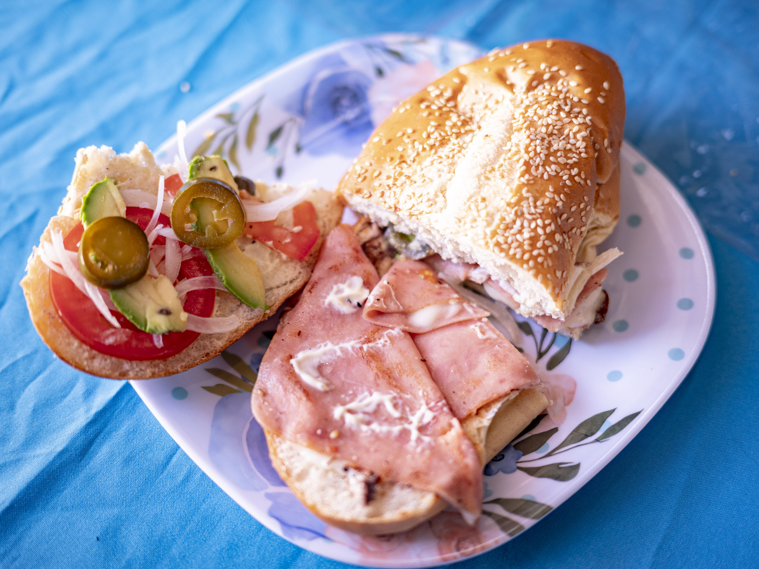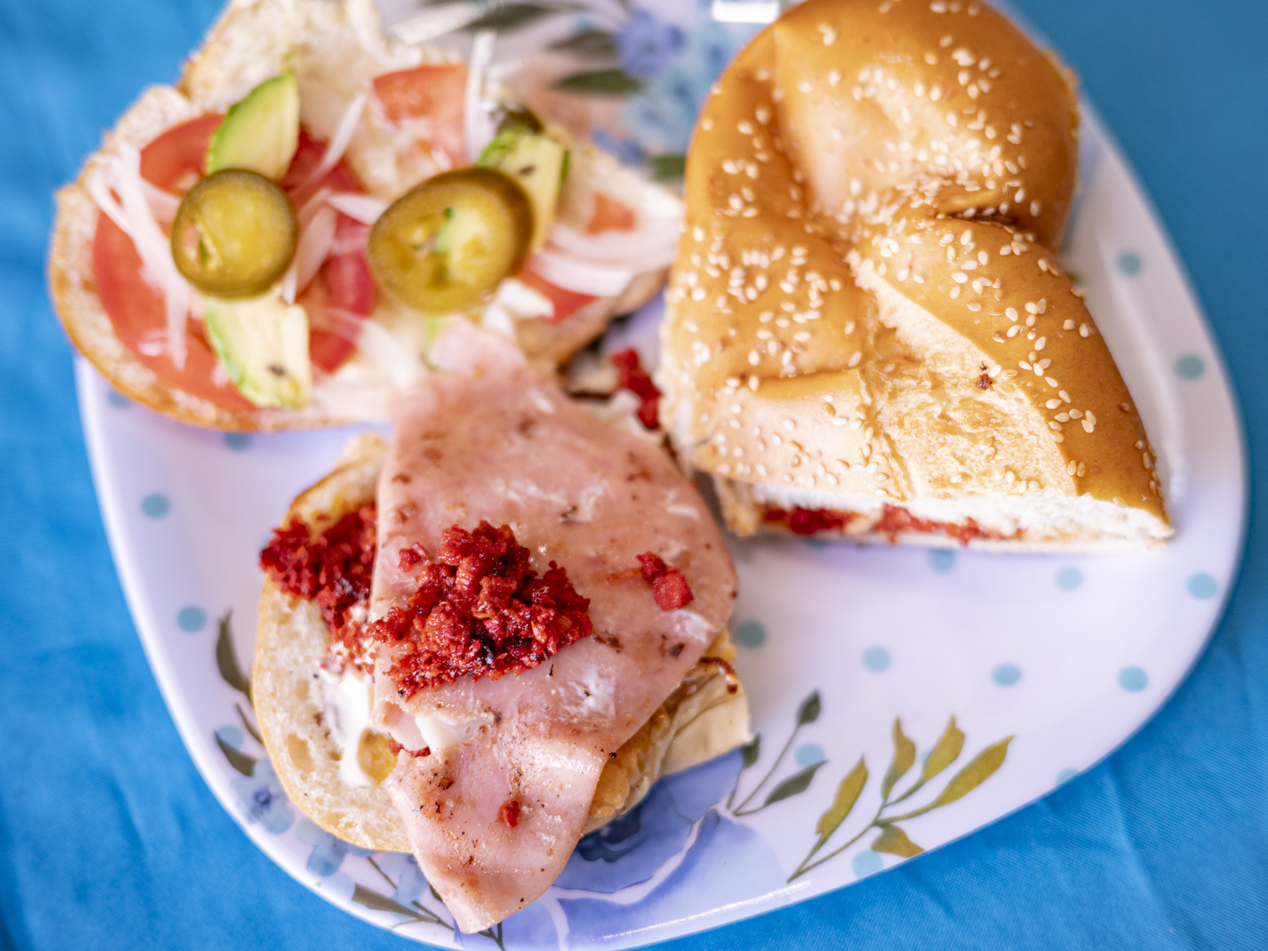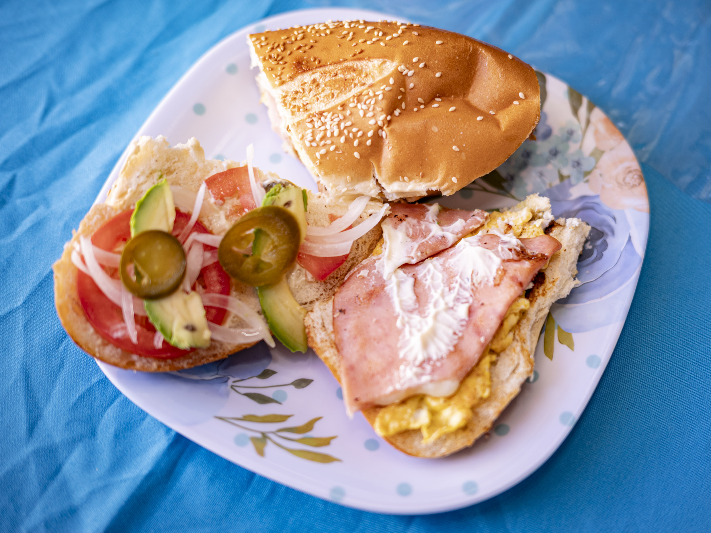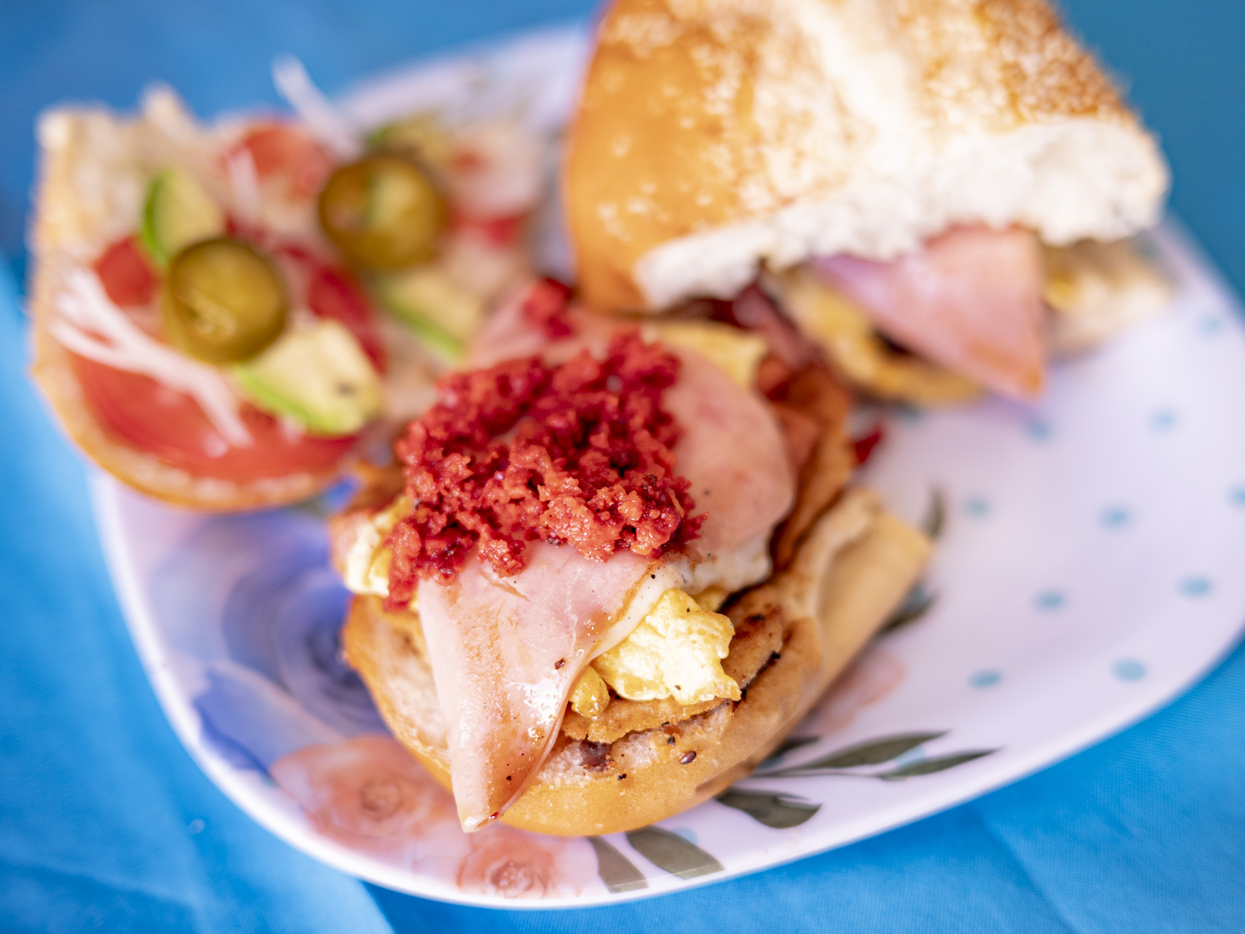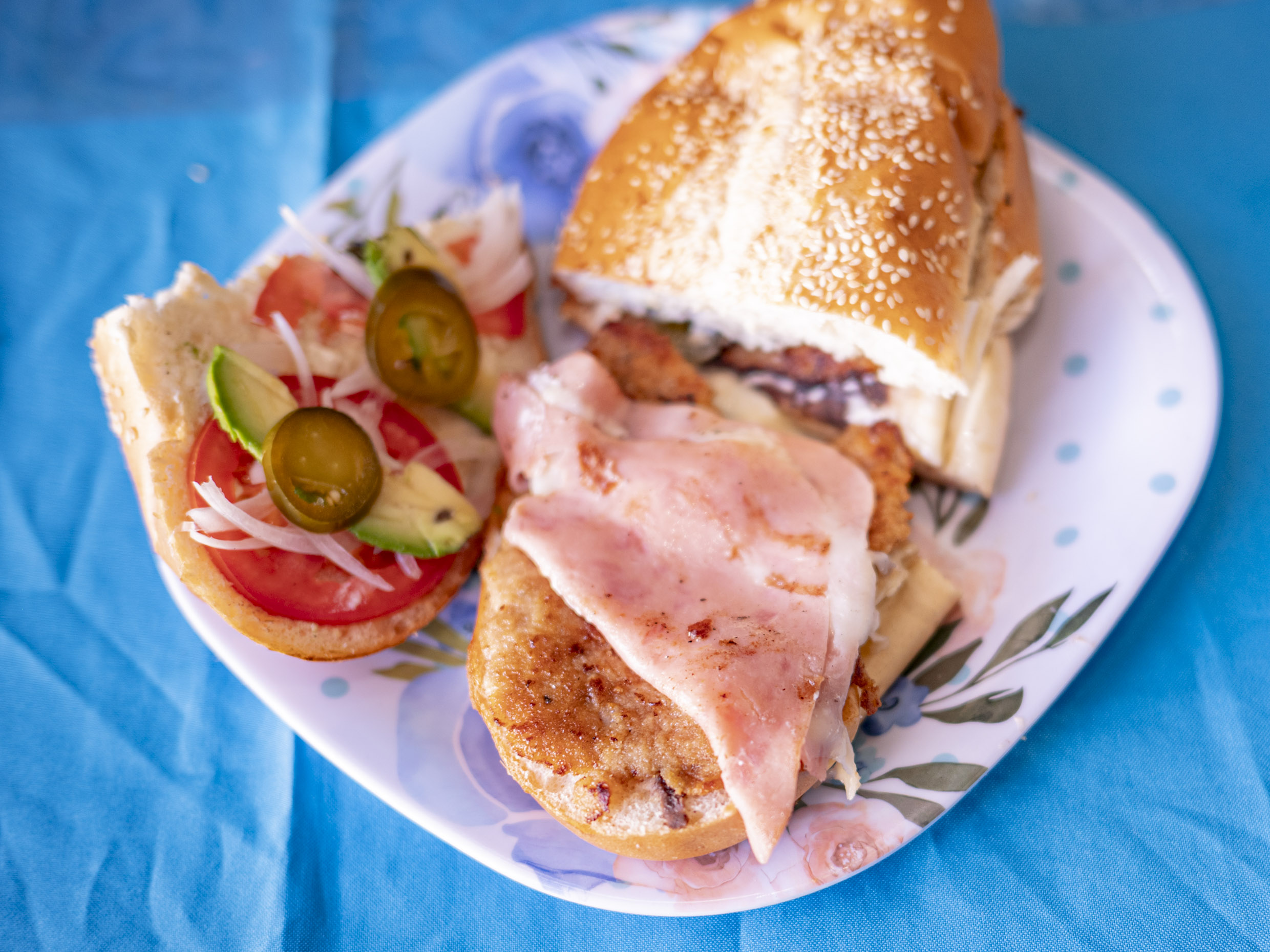 Acompañada de jamón y queso, frijol, mayonesa, tomate,, cebolla, aguacate y chiles jalapeños