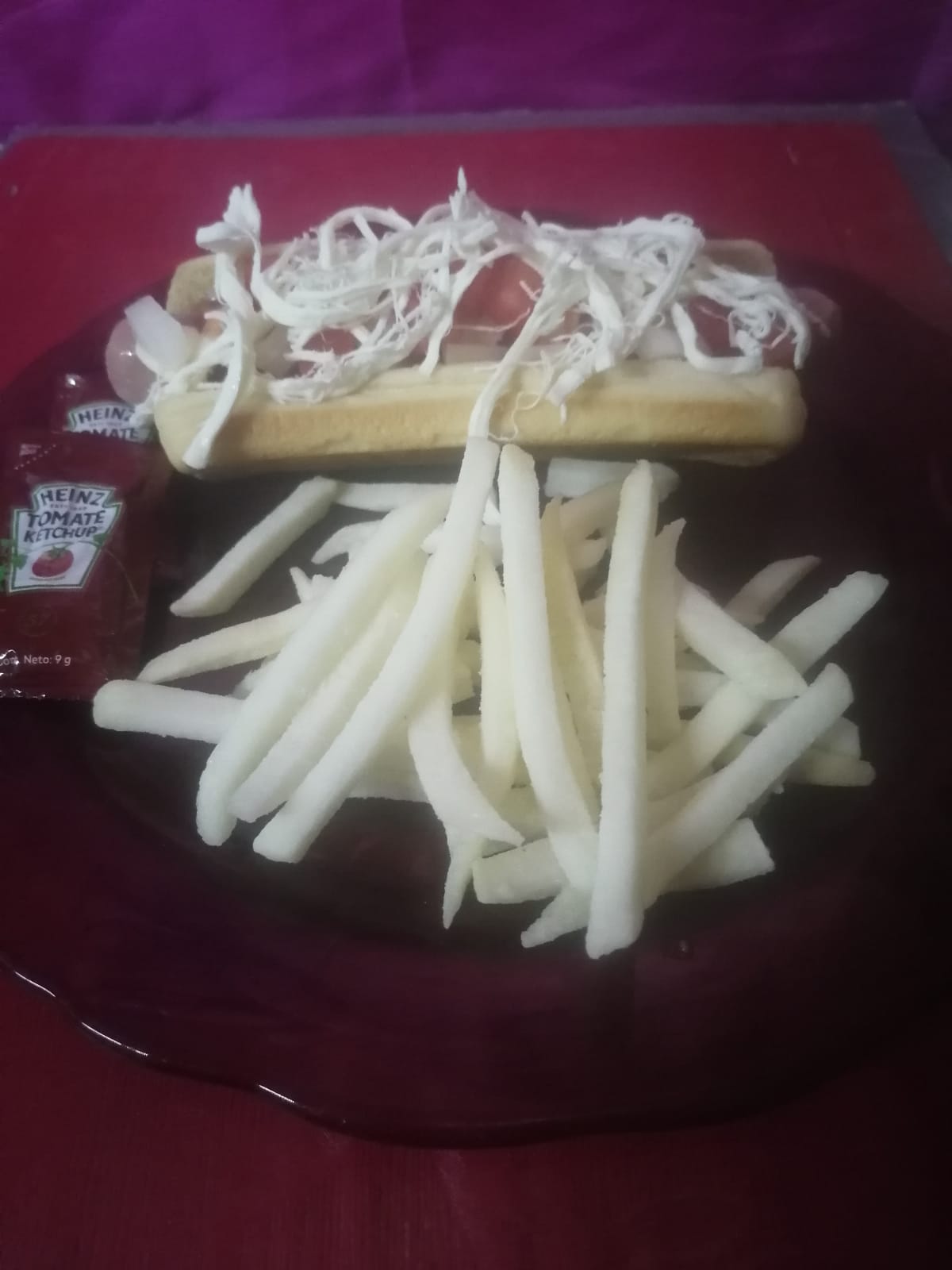 Acompañada de jamón, queso, tocineta, catsup,mostaza, mayonesa,tomate,lechuga, aguacate y cebolla caramelizada