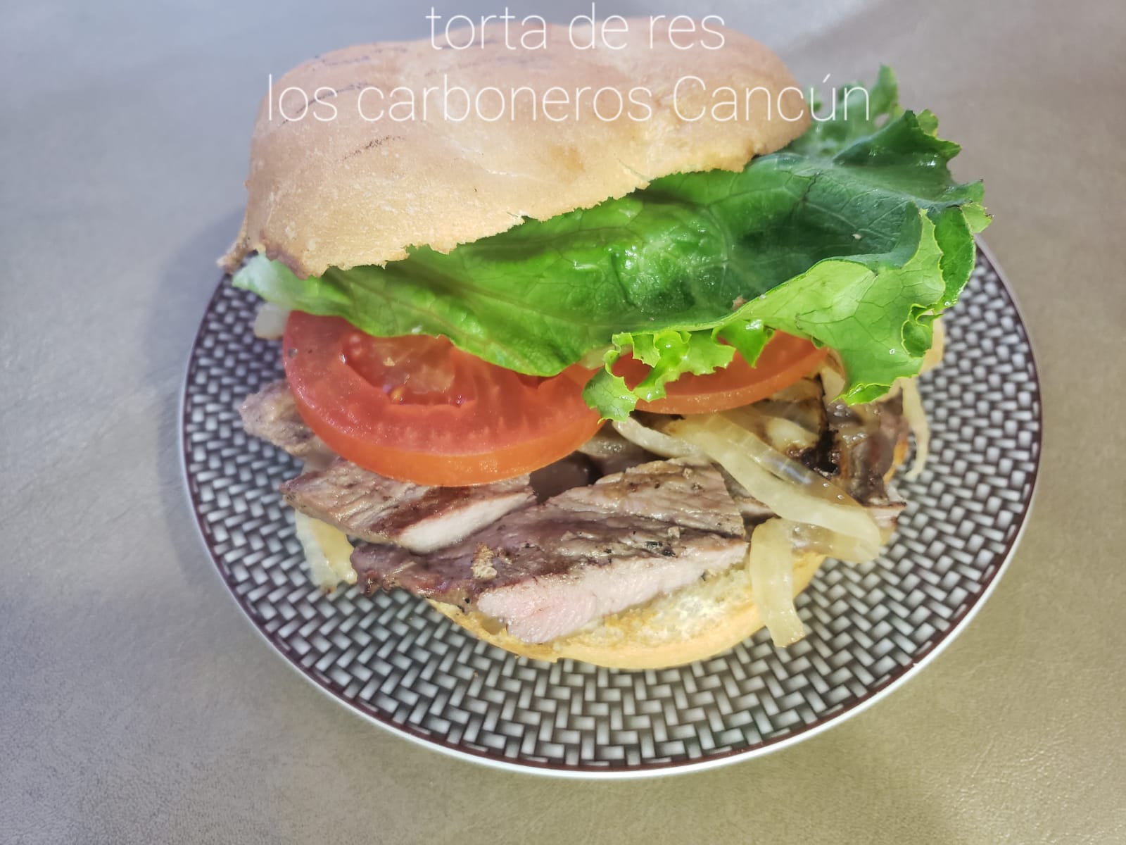 Telera crocante pasada por la parrilla cortada por la mitad en una tapa con mayonesa la otra con frijoles refritos caseros, carne top sirloin, cebolla asada, vegetales frescos (Lechuga y jitomate) y 2 salsas.