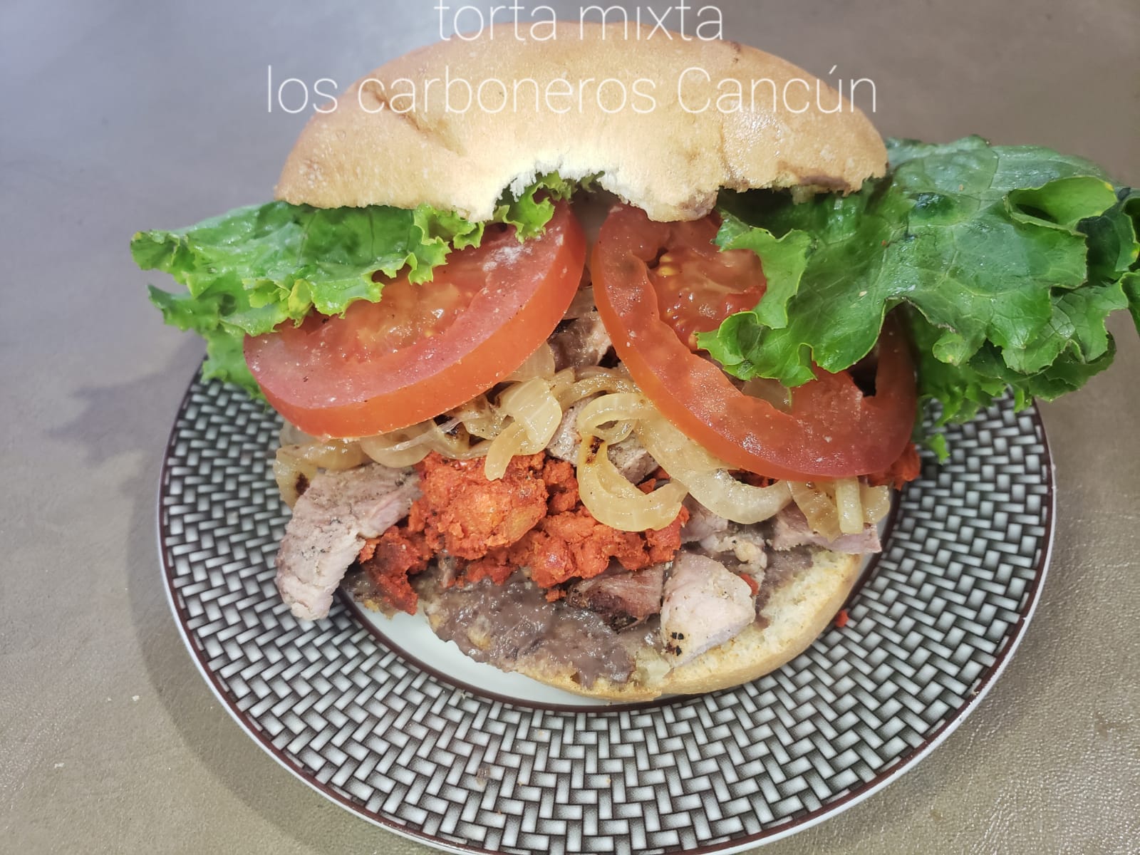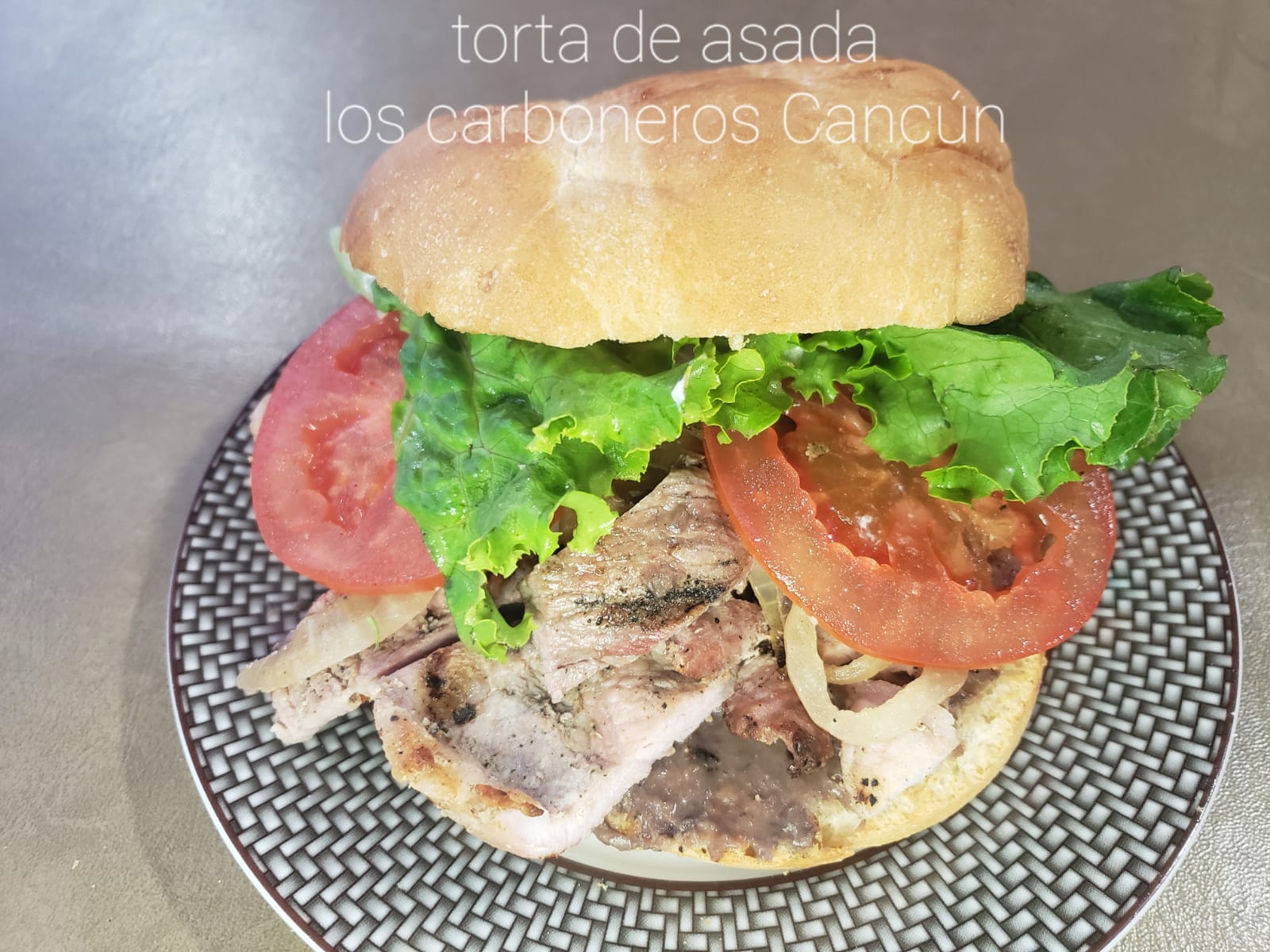 Carne 100% de res preparada con la receta de la casa, asada al carbón con un bollo con mayonesa pasado por la parrilla, con lechuga, jitomate, cebolla asada y trocitos de chile en vinagre, cátsup y mostaza.