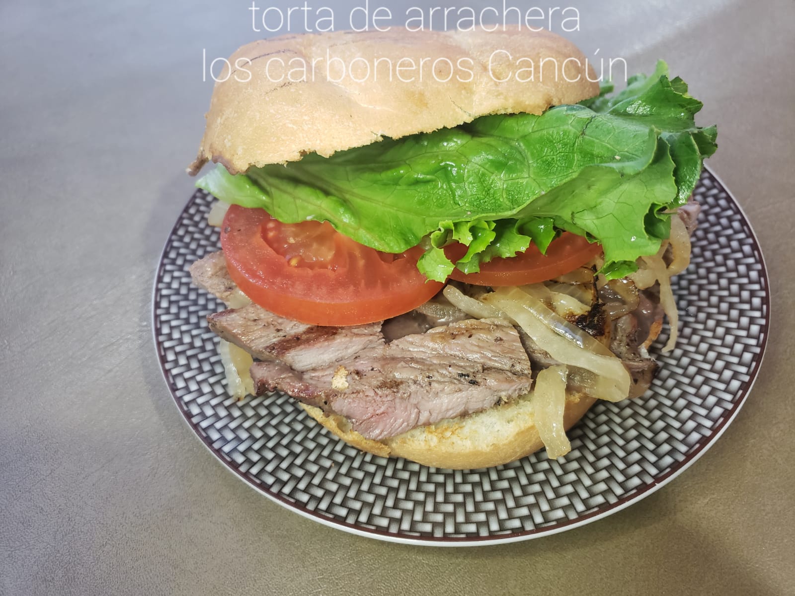 Telera crocante con mayonesa , frijoles refritos caseros, jugosa carne de arrachera, cebolla asada, vegetales frescos (Lechuga y jitomate) y 2 salsas.