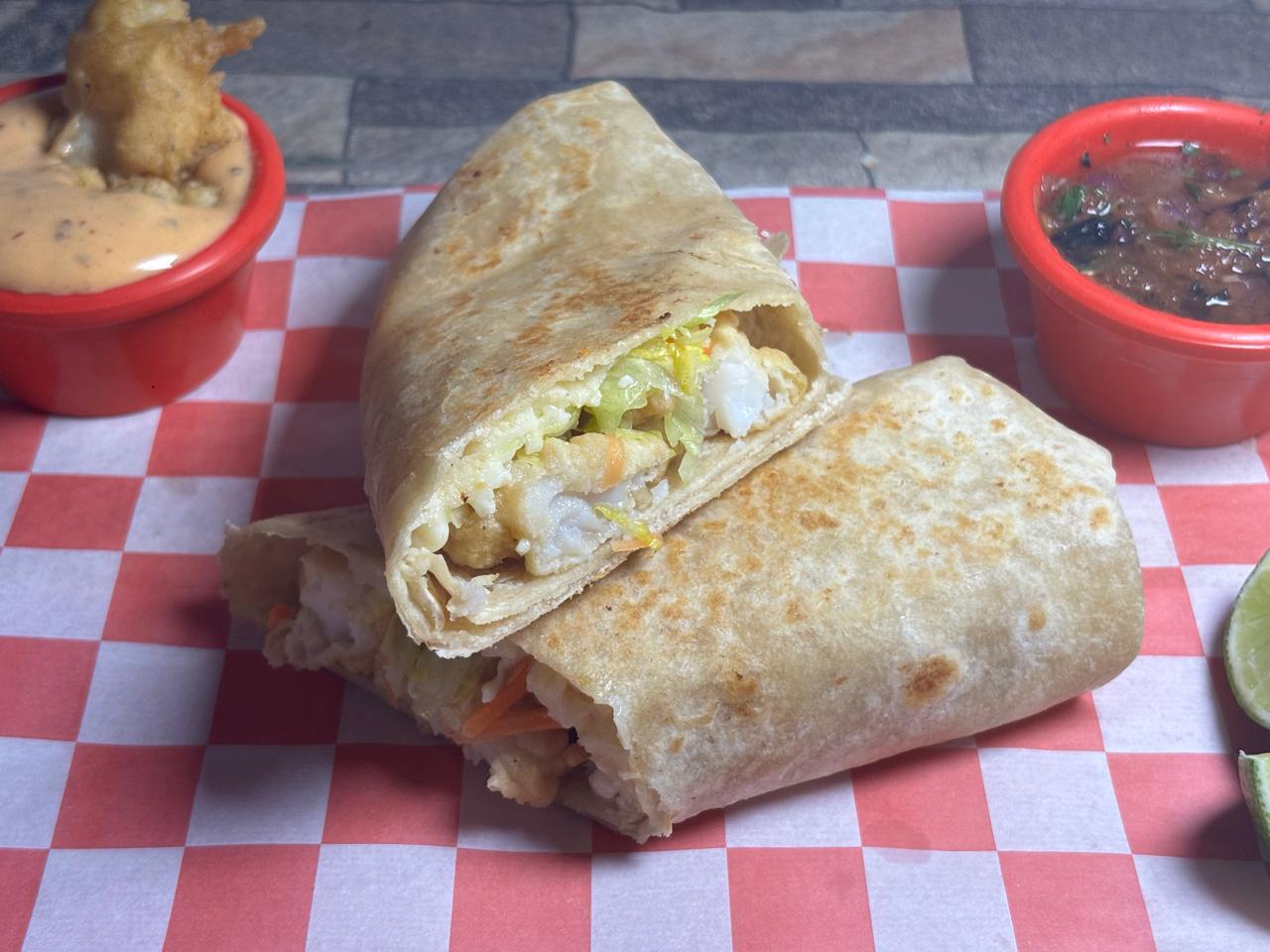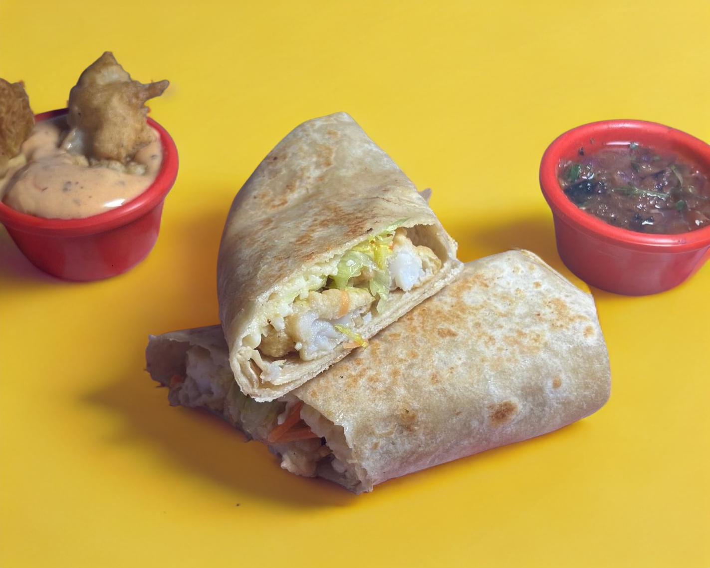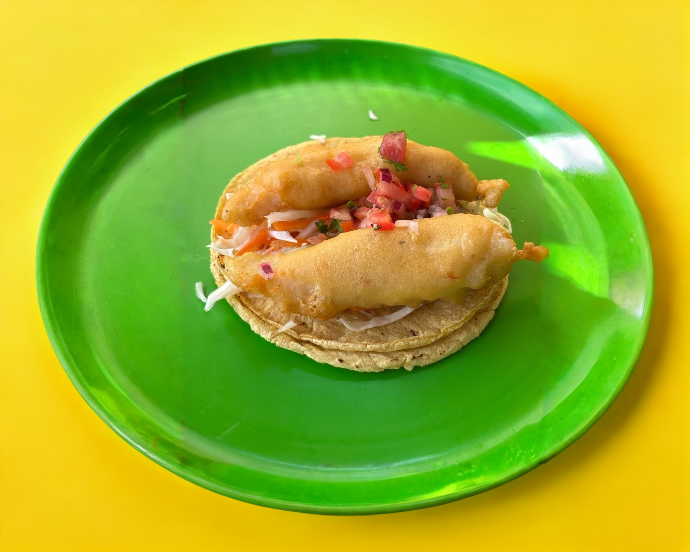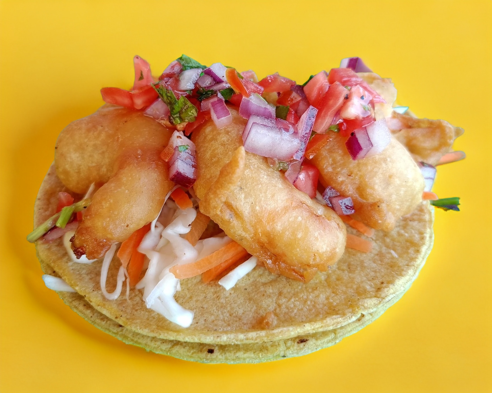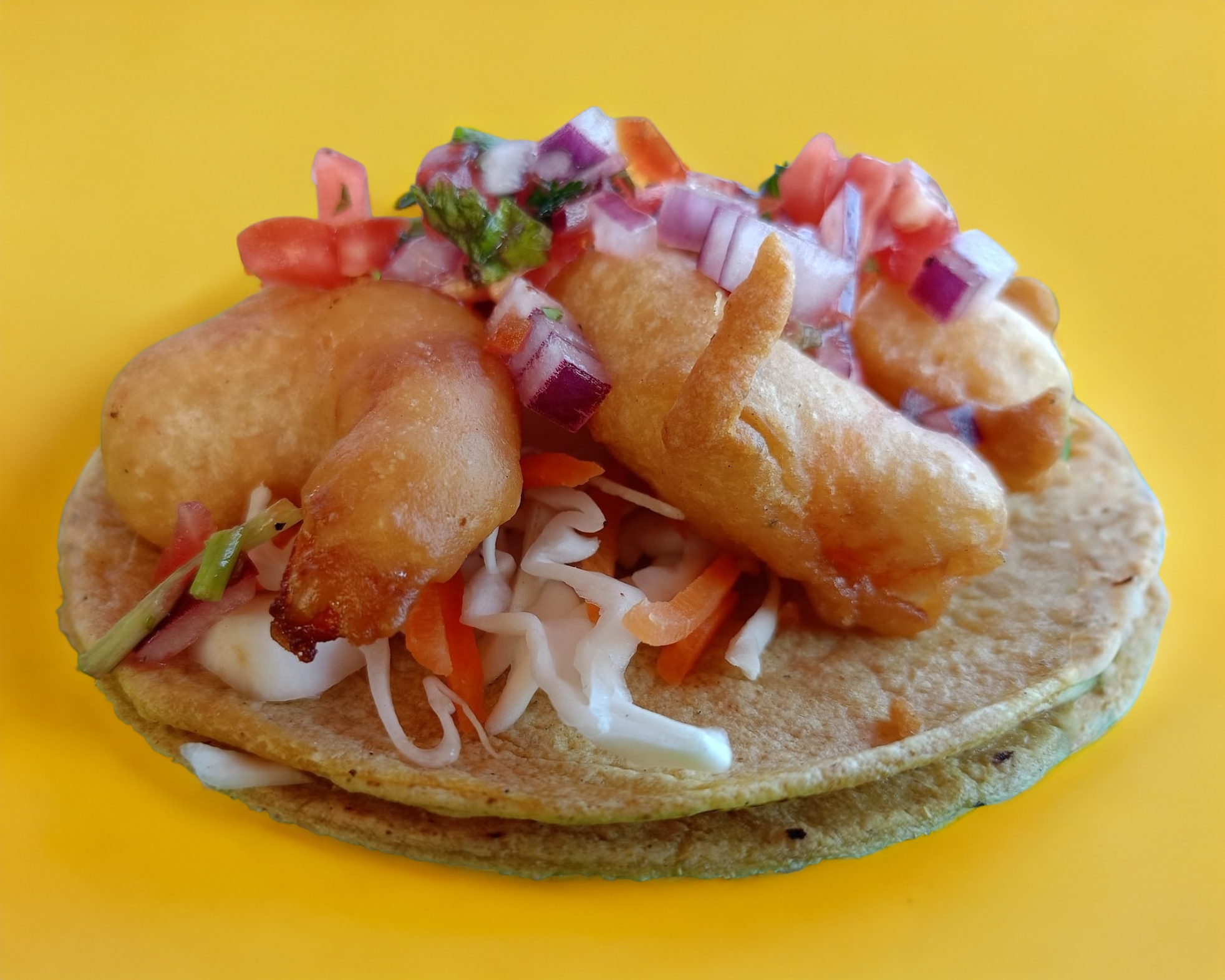 Tiras de pescado en tempura, lleva tortillas amarillas (2 pzas), una capa de ensalada de col blanca con zanahoria y el pescado. Salsa mexicana, salsa chipotle y salsa verde.