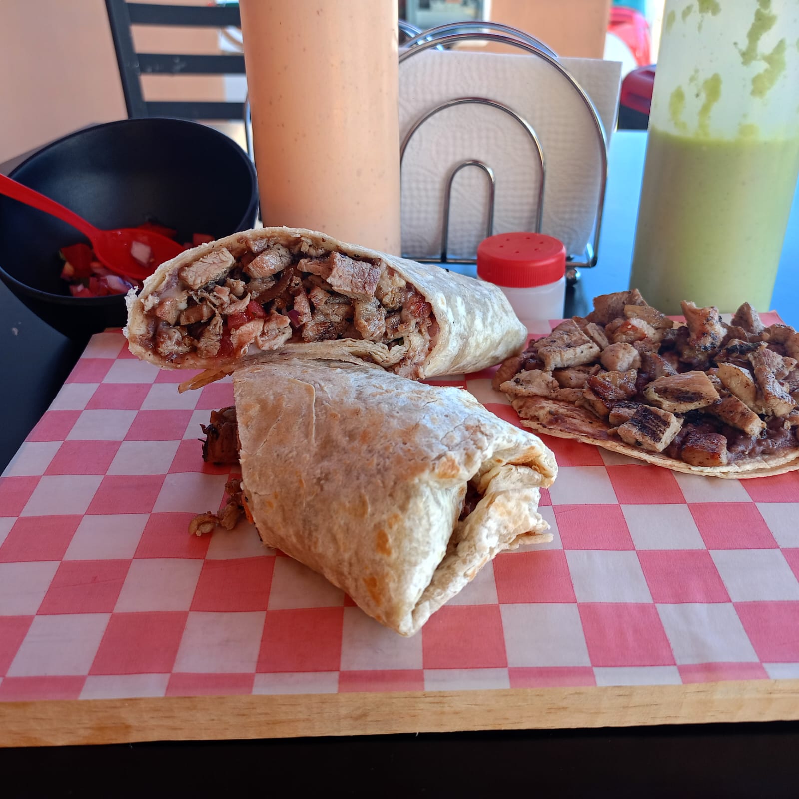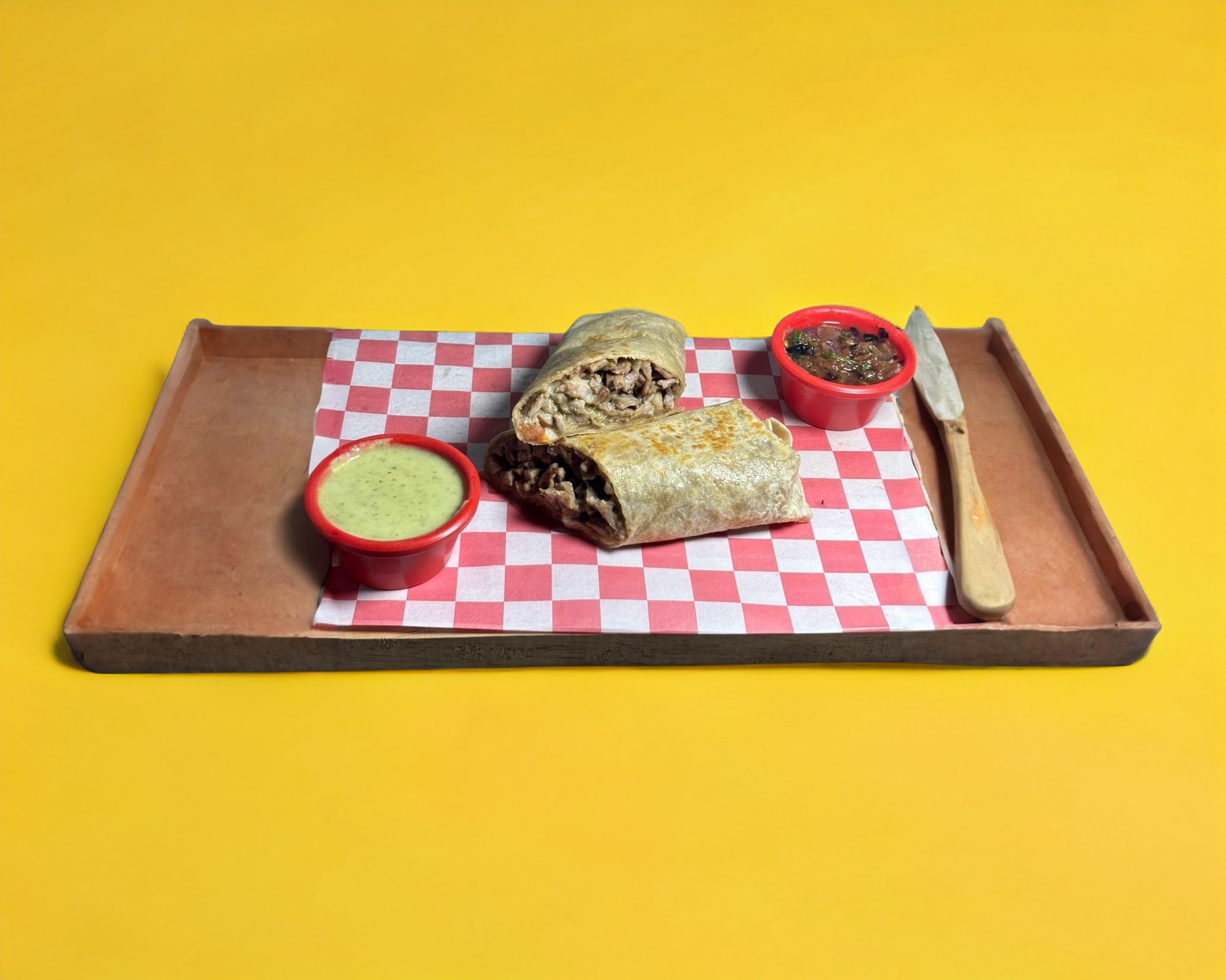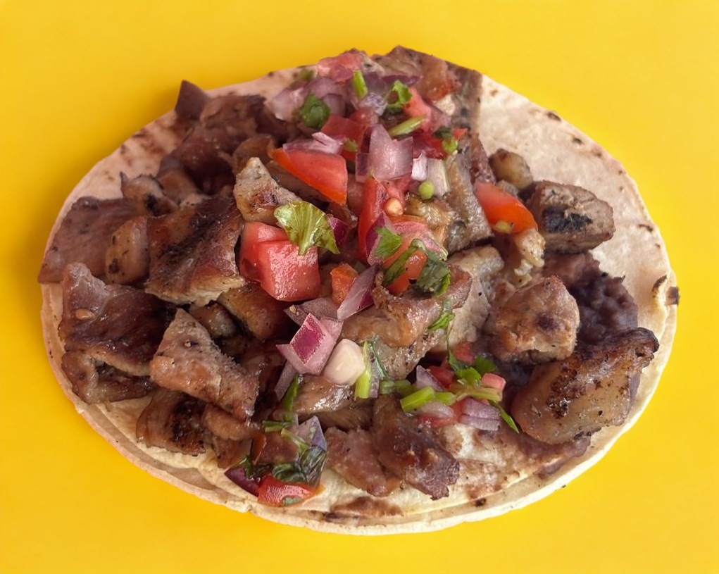 Tortilla de harina grande con una capa de frijol, una de queso mozzarella, una de salsa mexicana, 220 g de carne de cerdo asada y salsas: mexicana, verde y roja.