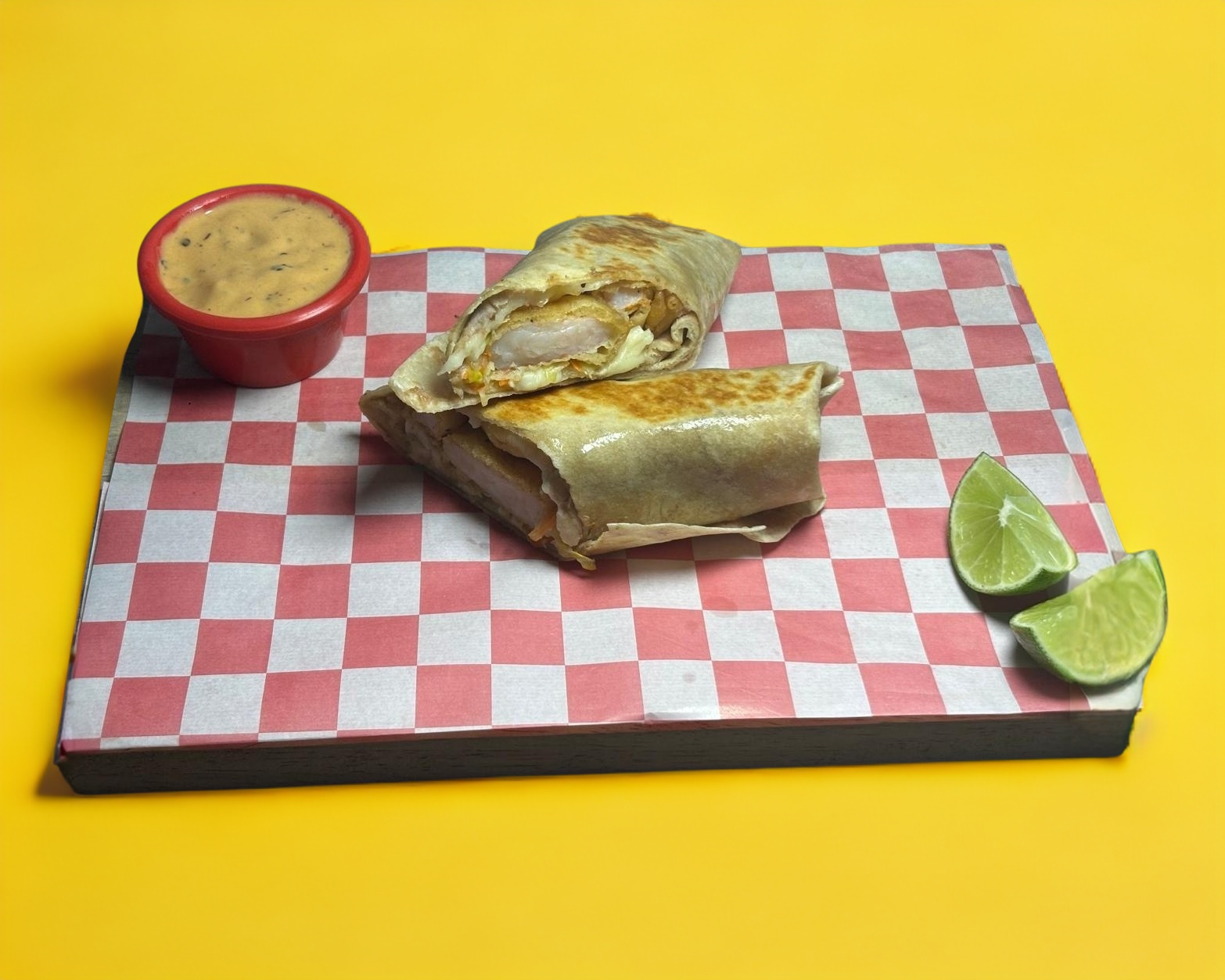 Lleva tortillas de harina grandes, lleva una capa de queso mozzarella, una cama de ensalada, lleva camarón y pescado. Salsa chipotle, salsa mexicana y salsa verde.