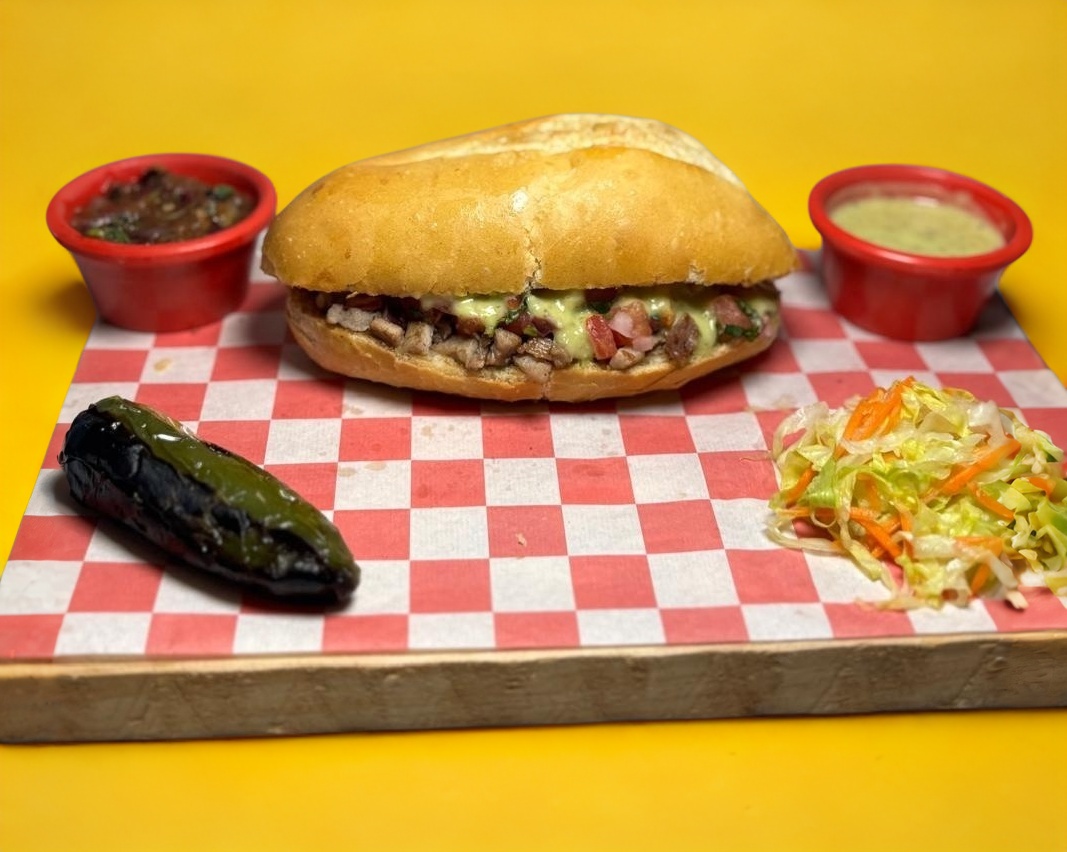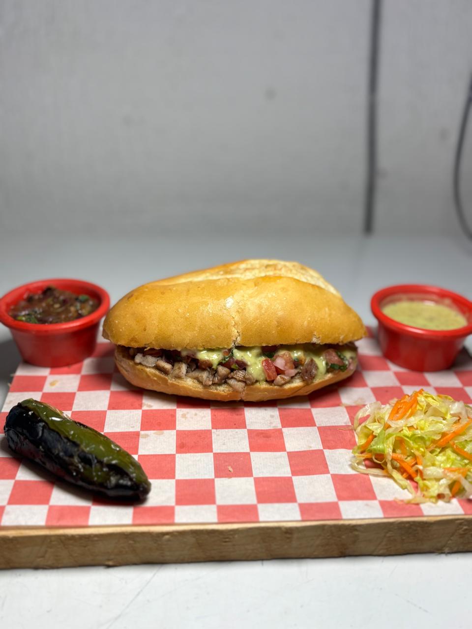 Es el pan de bolillo, lleva una capa de frijol, la carne asada y por separado lleva las salsas: a la mexicana, salsa verde y salsa roja con tomates rojos, cebolla, cilantro y chiles habaneros asados.