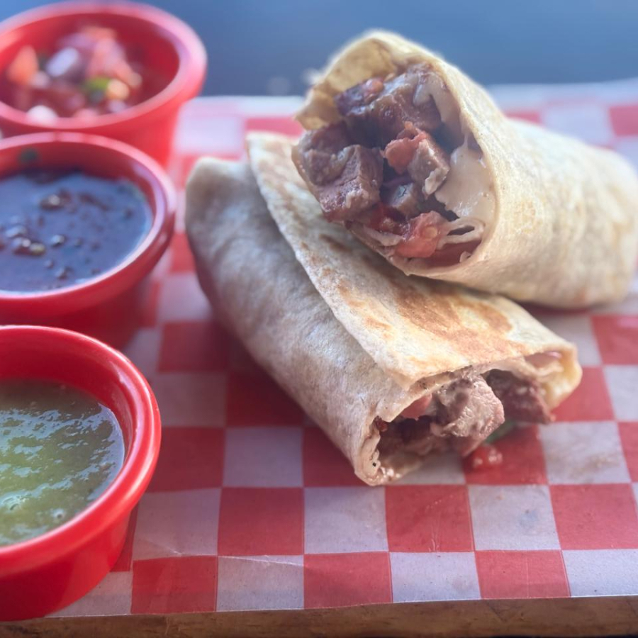 Burrito(Tortilla de Harina grande con una capa de frijol,queso chihuahua gratinado pico de gallo, Arrachera y salsas por aparte verde y Roja chiles y tomates asados