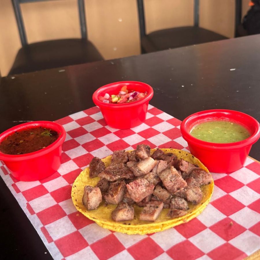 Tacos(Arrachera asada al carbón con tortilla normales,lleva una capa de frijol y por separado las salsas roja,verde y pico de gallo