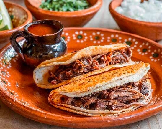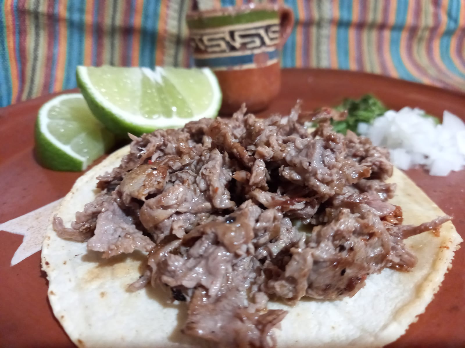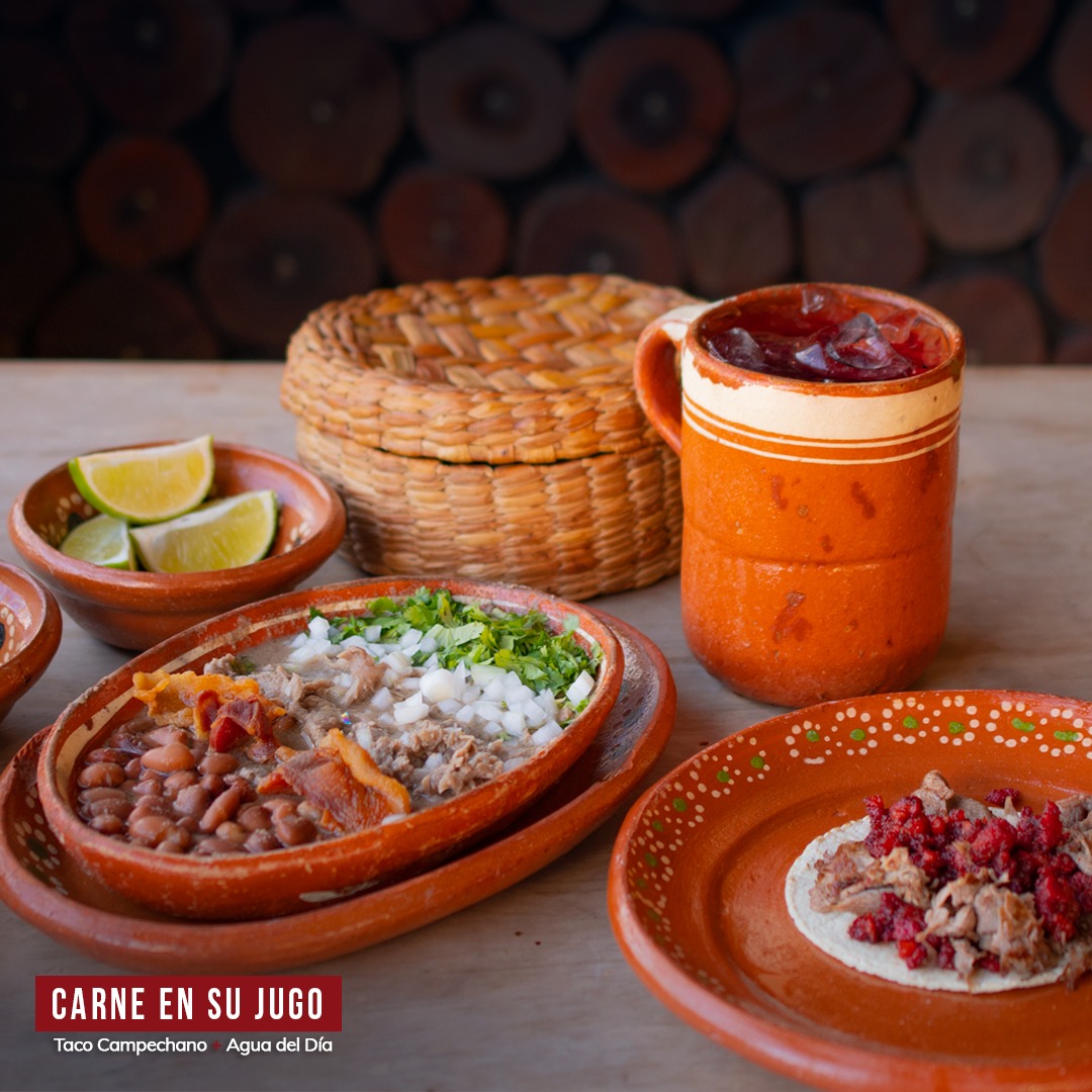 Carne en su jugo chico+agua de jamaica+taco campechano