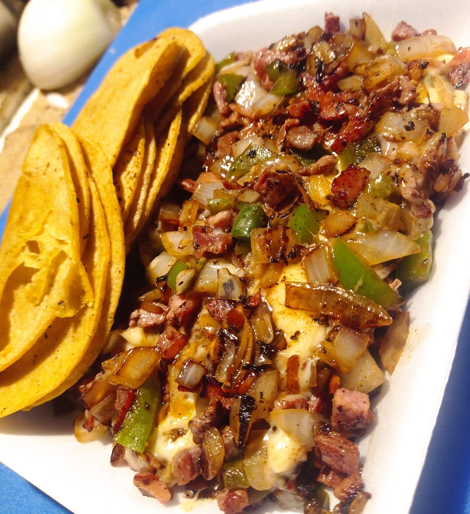 Cebolla, chile morrón, frijol 150 g de carne, queso y papas a la francesa.