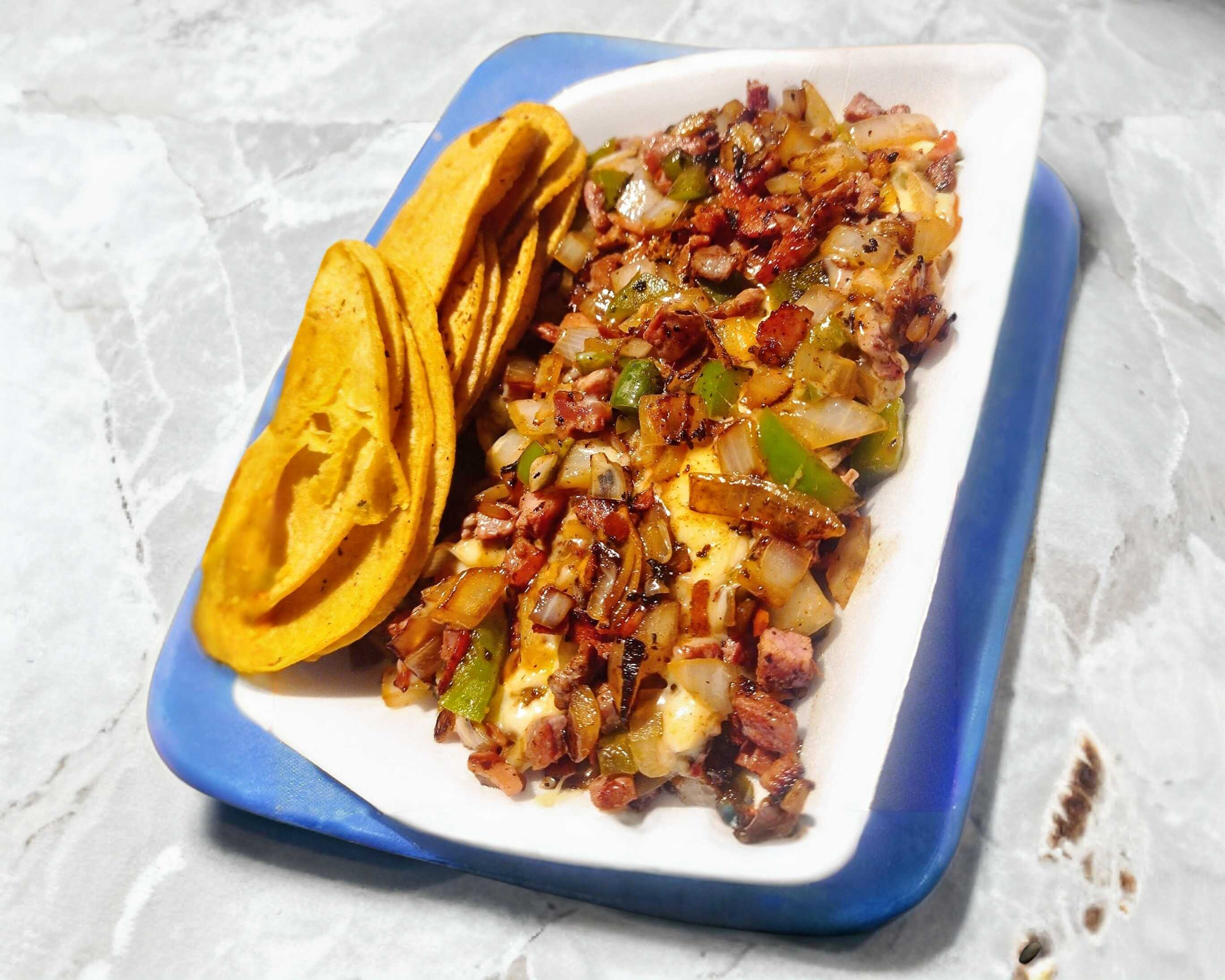Porción personal: Cebolla, chile morrón, jamón, tocino, 150 g de carne, queso y tortilla.