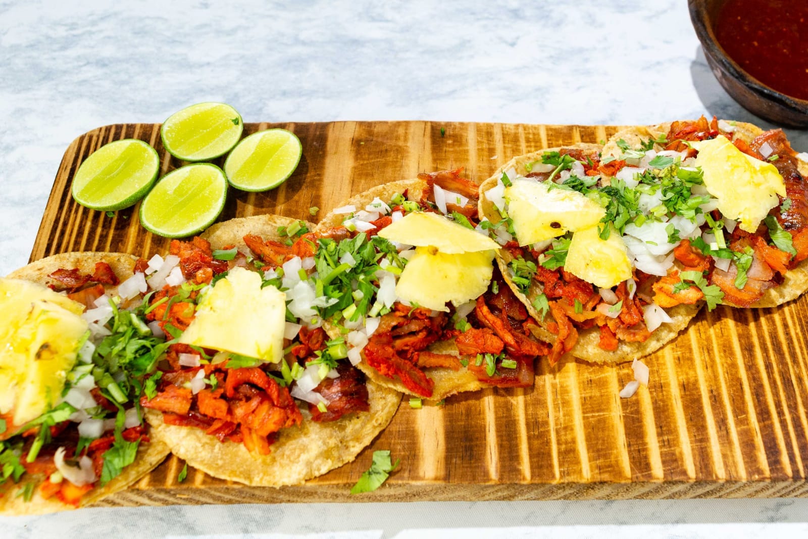 Orden de tacos con doble tortilla y 150 g carne al pastor, con queso extra (opcional). incluye salsa y verduras