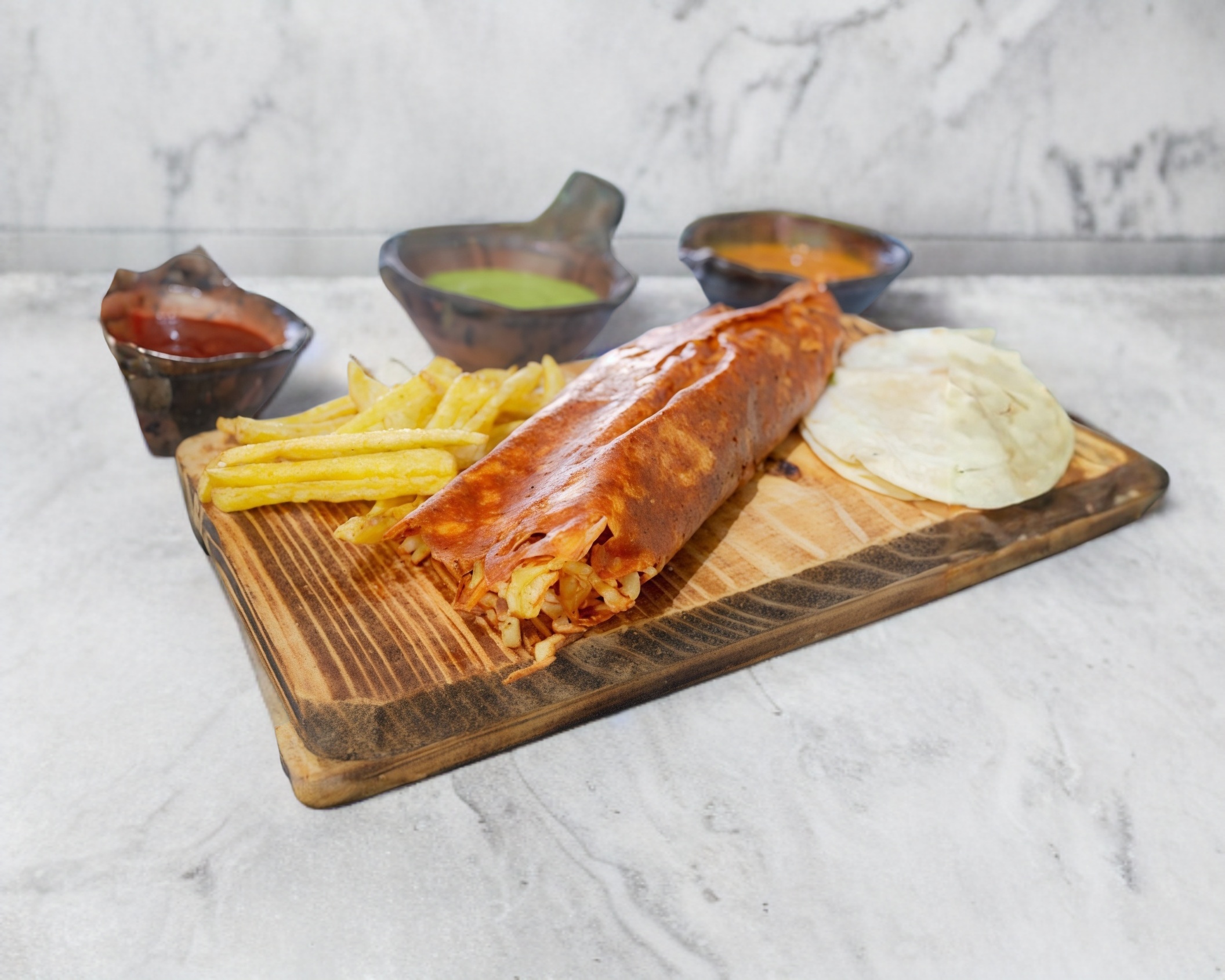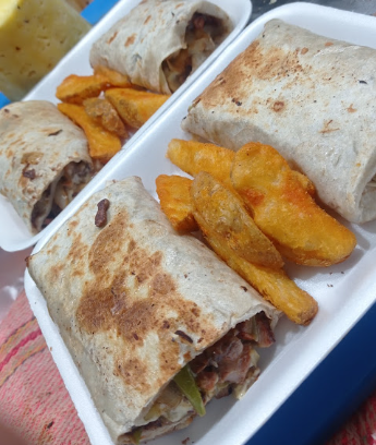 Costra de queso, 150 g de carne con 4 tortillas de harina y papas.