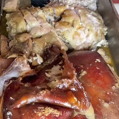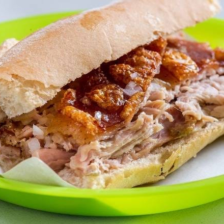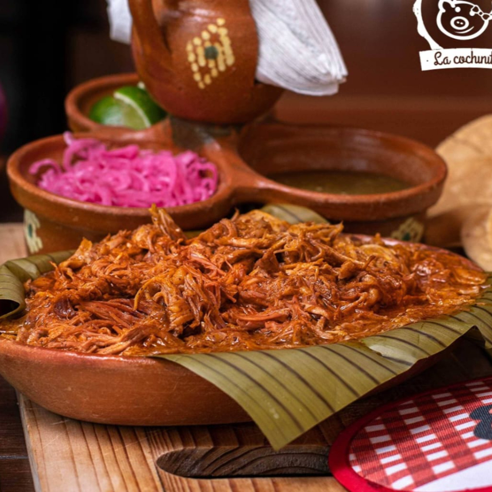 Kilo de lechón al horno con porción de cuero crujiente salsas y cebolla