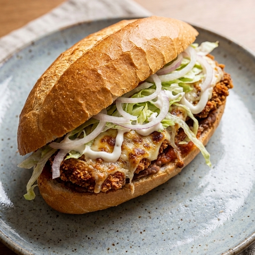 Torta relleno de empanizado de pollo con queso gratinado lechuga cebolla crema queso espolvoreado