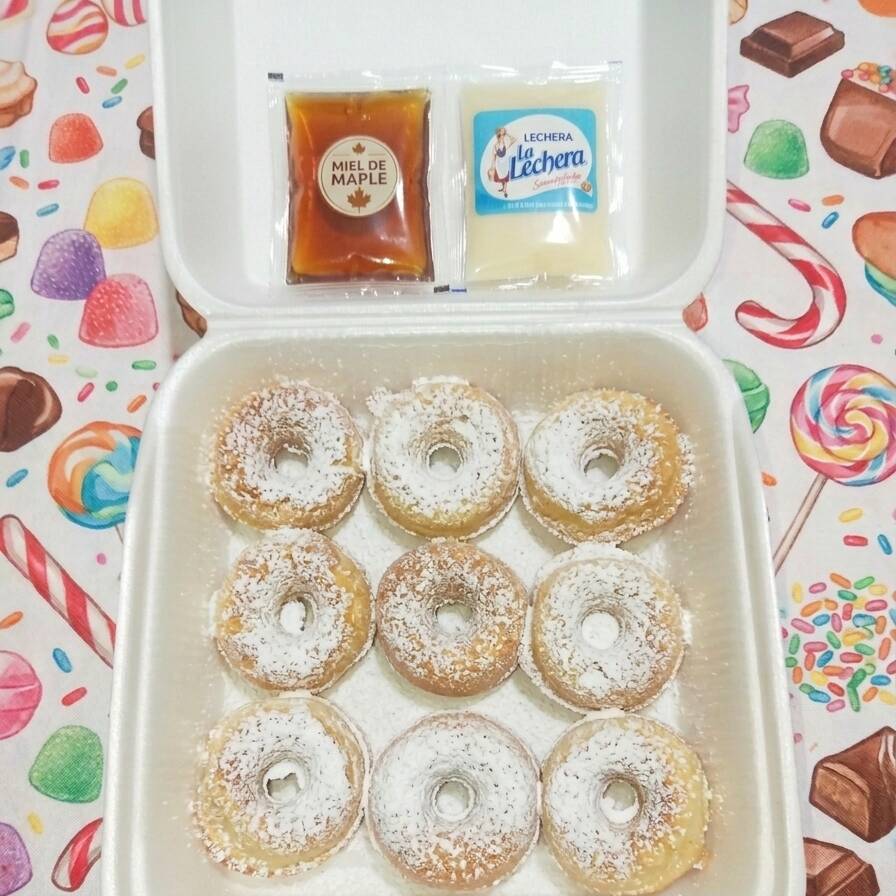 9 mini donas espolvoreadas con azúcar glass acompañadas de miel de maple y leche dulce lechera
