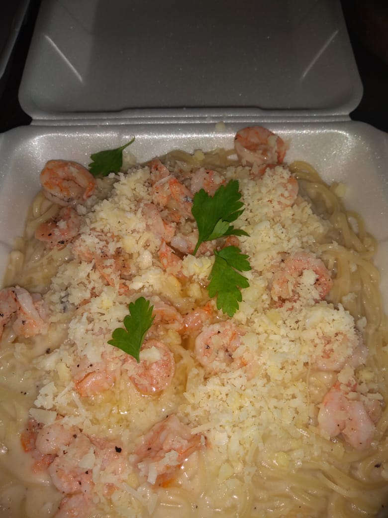 Espagueti para 2 personas,1kg. Salsa de queso parmesano con camarones y pollo