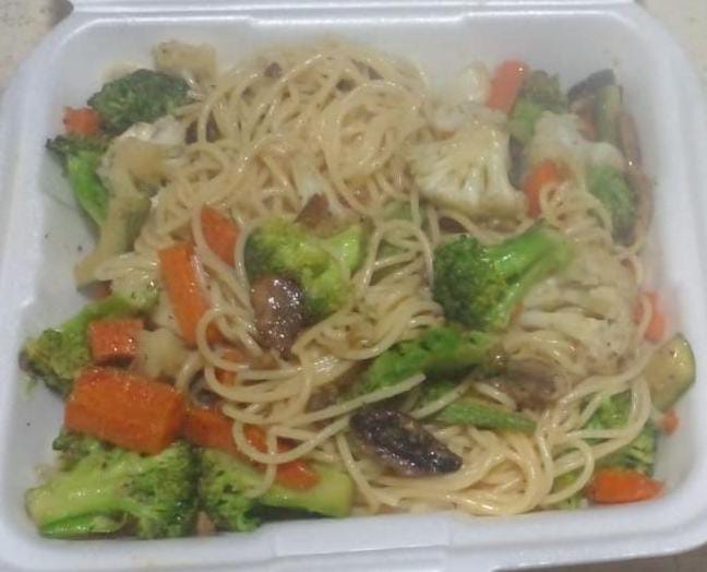 Espagueti para 2 personas, 900 gm. Acompañado de pan al ajo y chile quebrado.