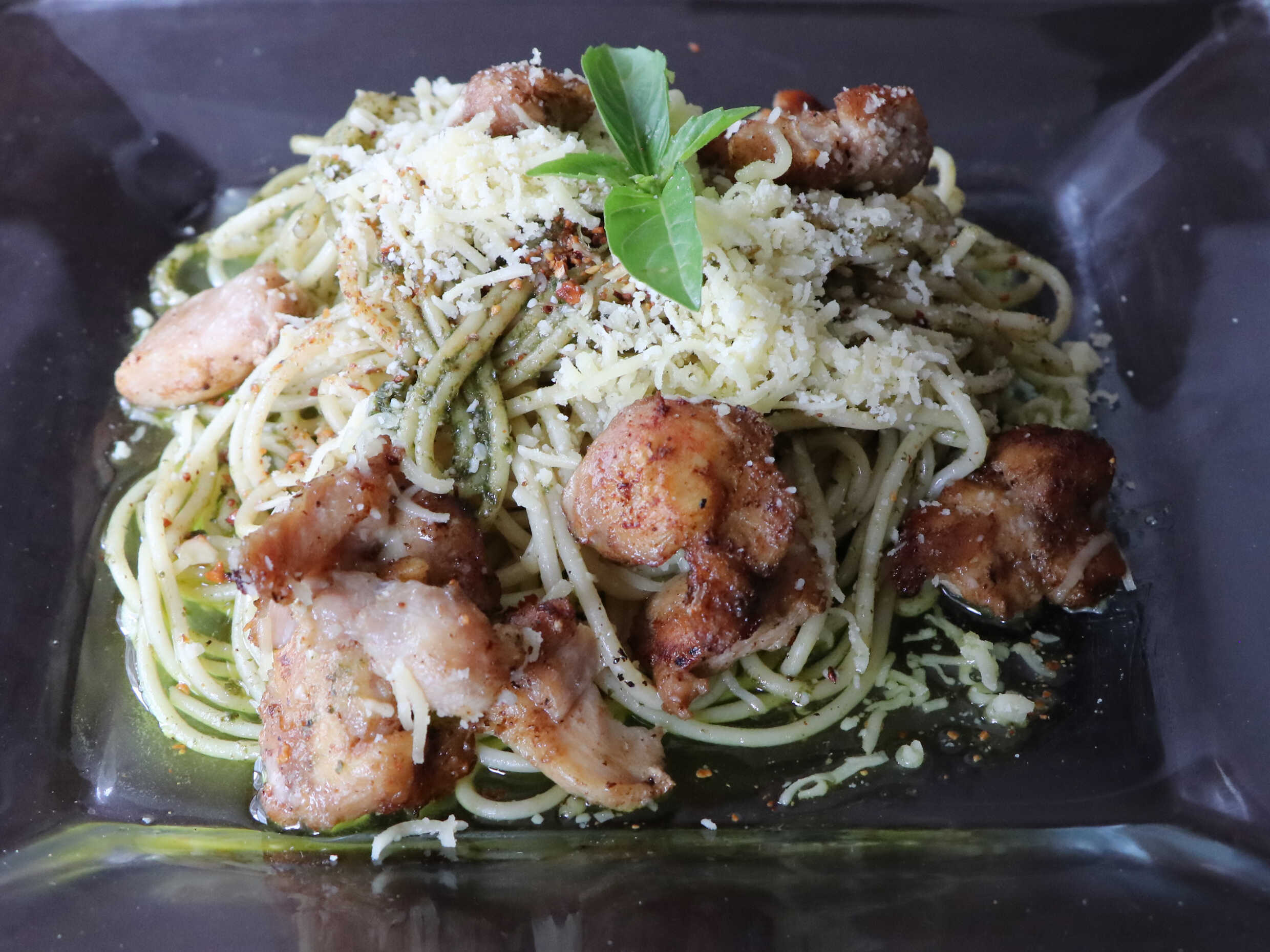 Pasta al Aceite de Oliva y Ajo con Pollo a la Plan