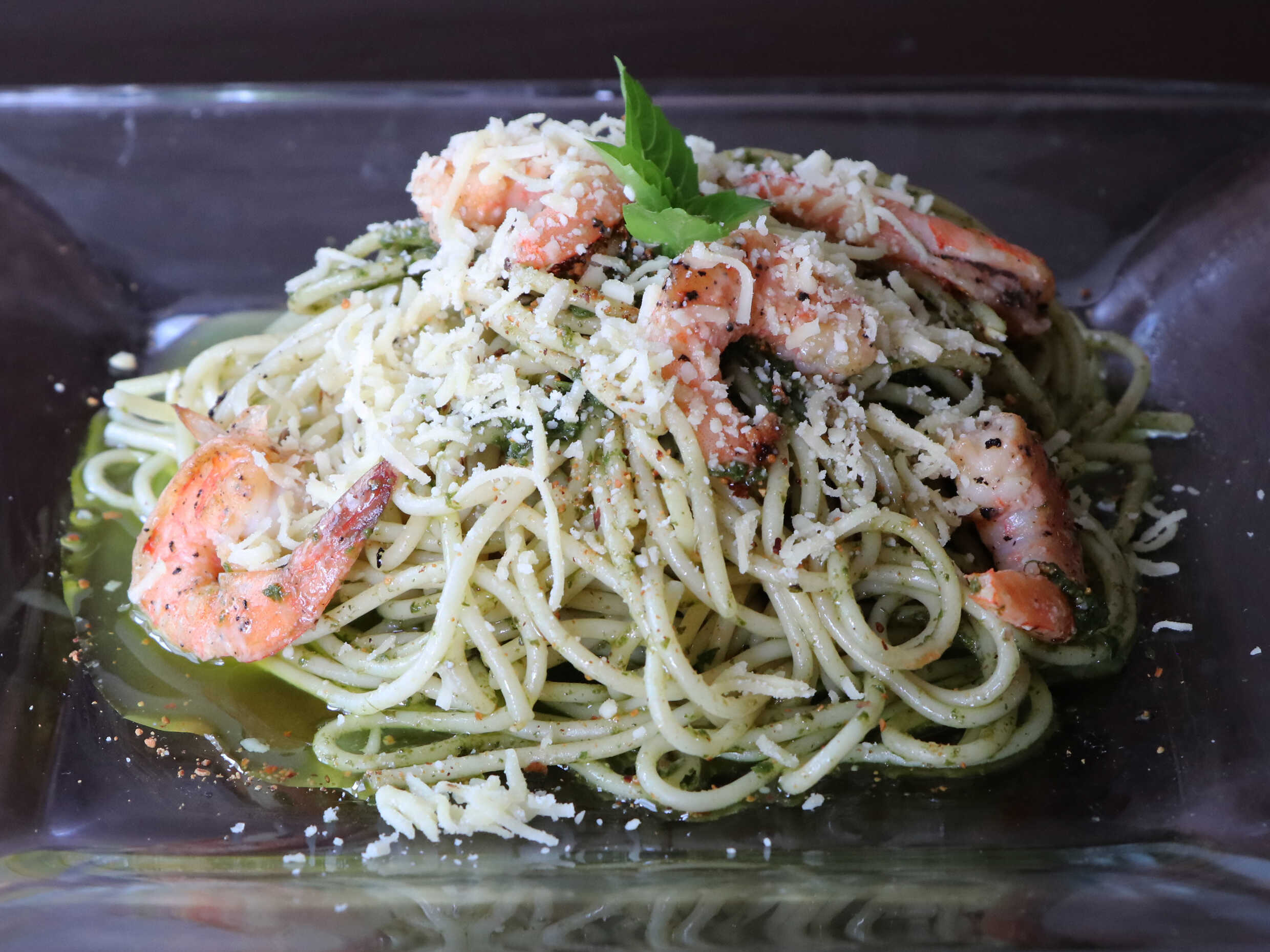 Espagueti para 2 personas salsa de aceite de oliva, ajo, albahaca y piñones, servida con camarones al ajo, acompañado de pan al ajo y chile seco.