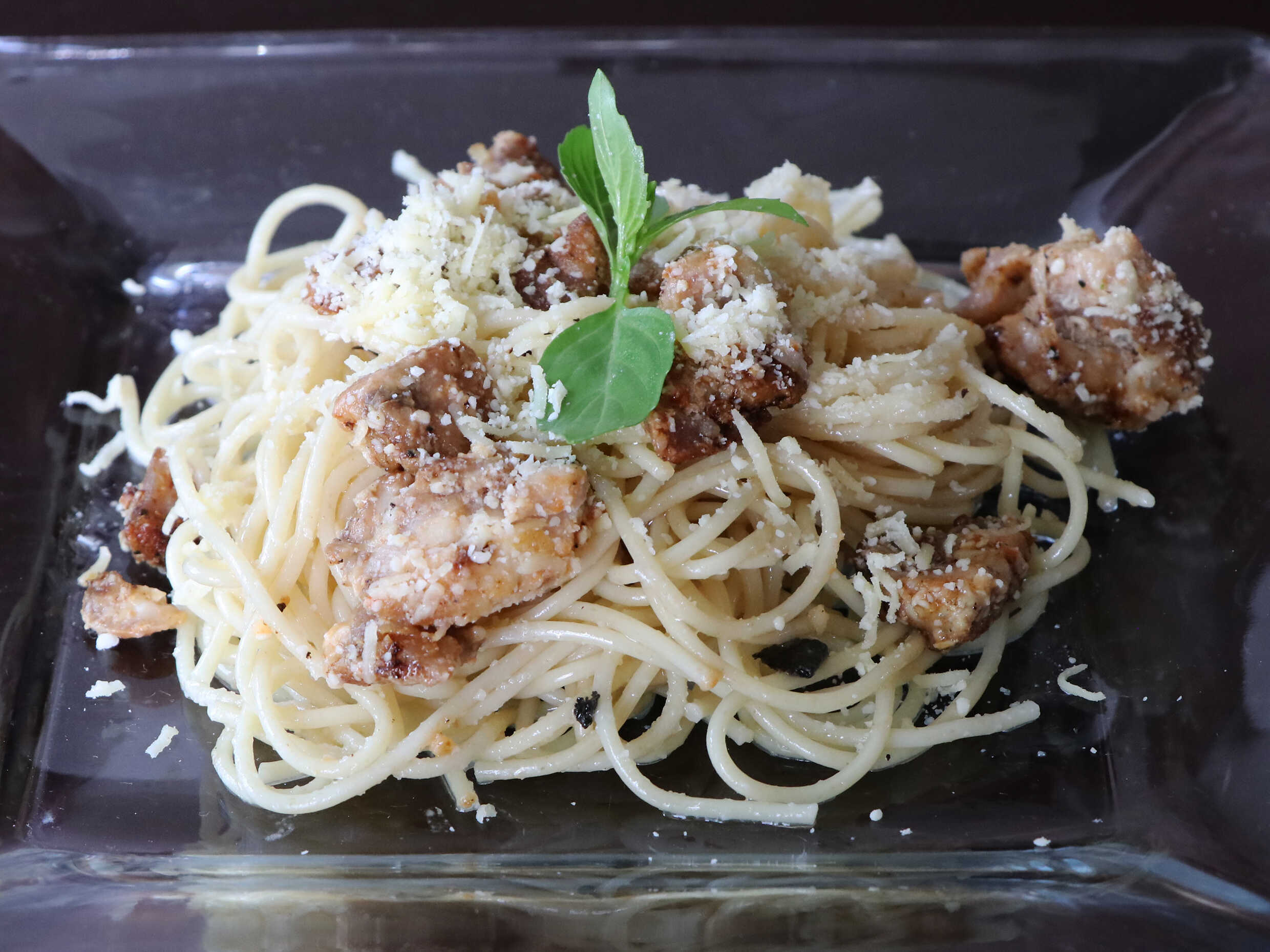 Espagueti para 2 personas.900 gm. tocino, parmesano en salsa cremosa, acompañada de pan al ajo y chile quebrado.