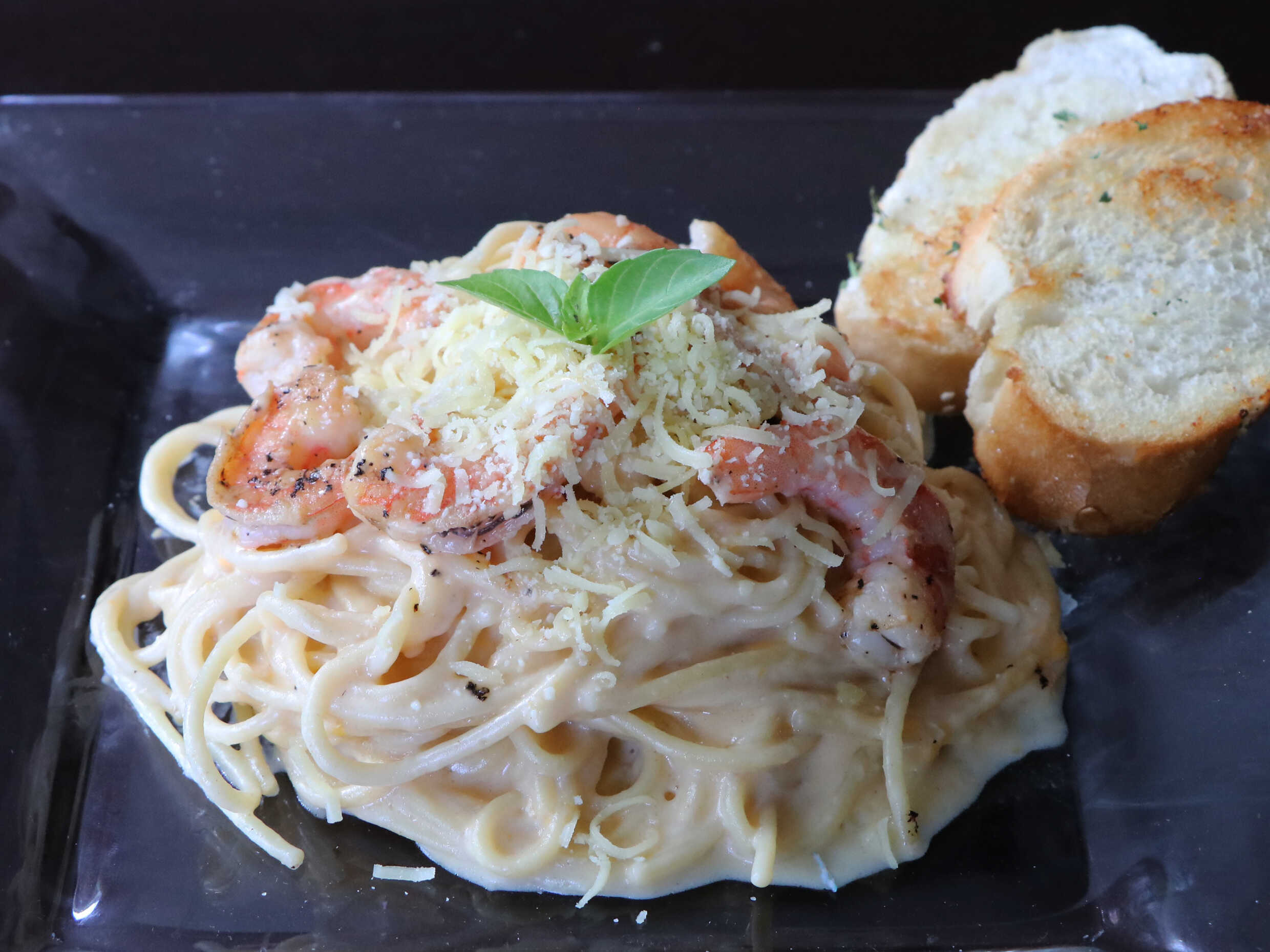 Espagueti para 2 personas.900 gm, deliciosa salsa alfredo de champiñones, jamón, crema blanca y camarones a la plancha, acompañado de pan al ajo y chile quebrado.