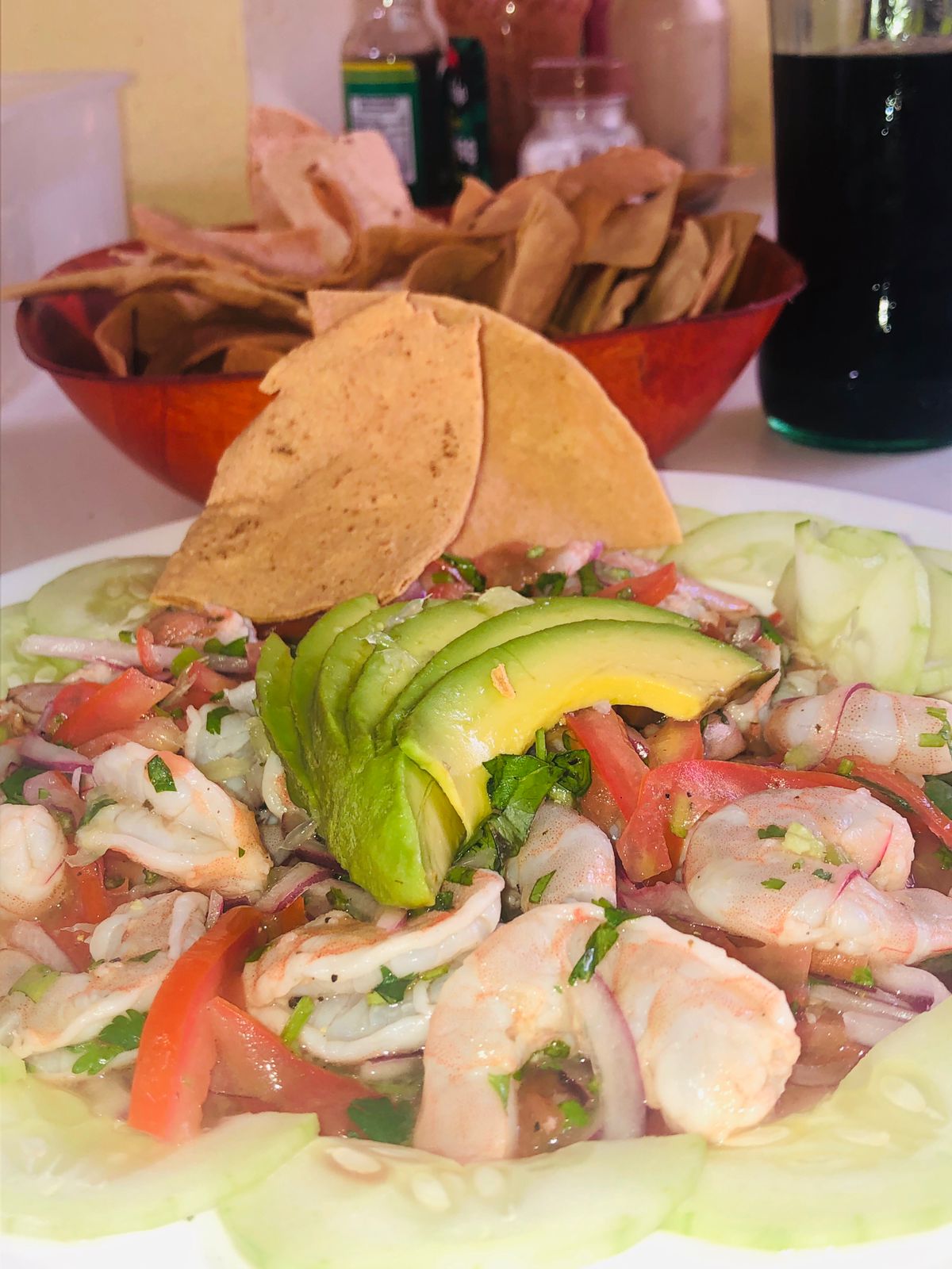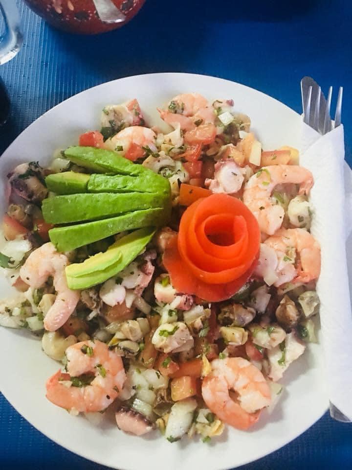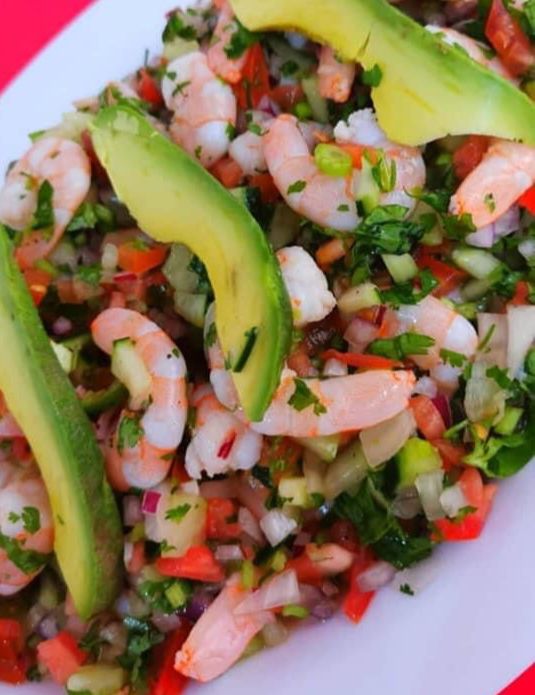 Camarones marinados al limón con una deliciosa combinación de chiles asados, aguacate y demás ingredientes secretos caseros.