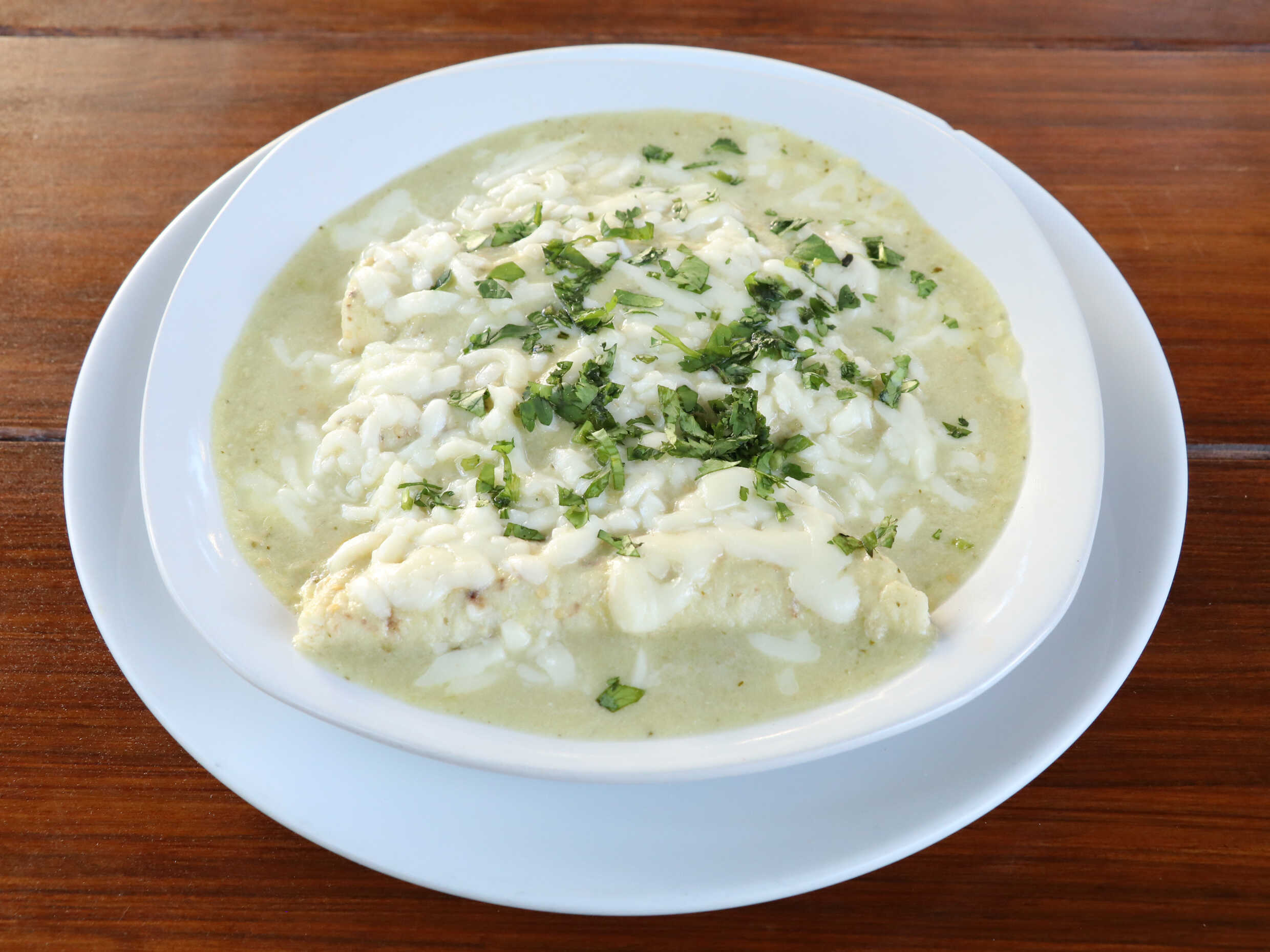 Enchiladas rellenas de pollo, cubiertas de salsa a escoger suiza, mole, verde o roja, incluye crema, queso, arroz y frijolitos.