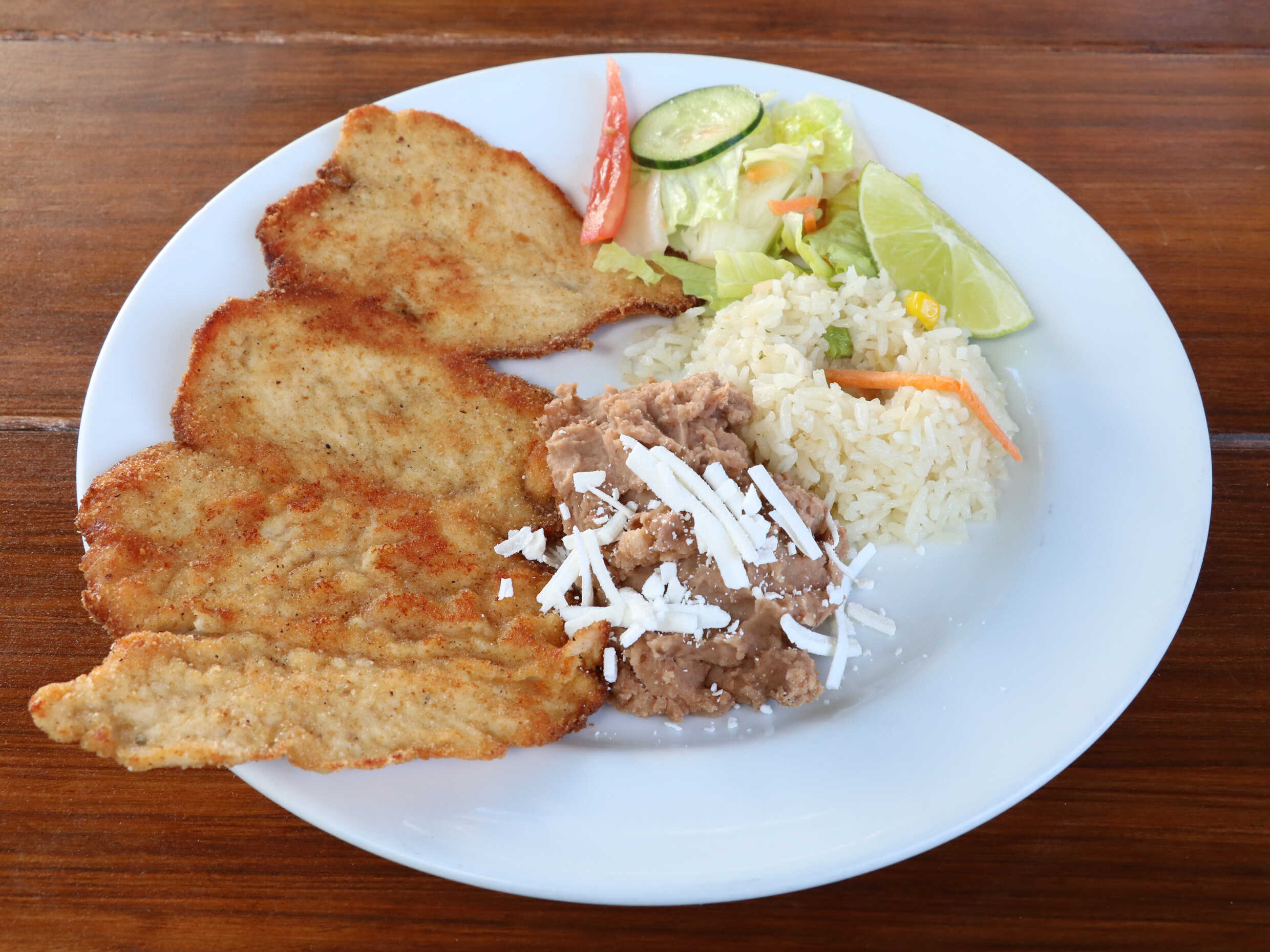 Pechuga de pollo con nuestro empanizado especial, acompañada de arroz, frijol y ensalada.