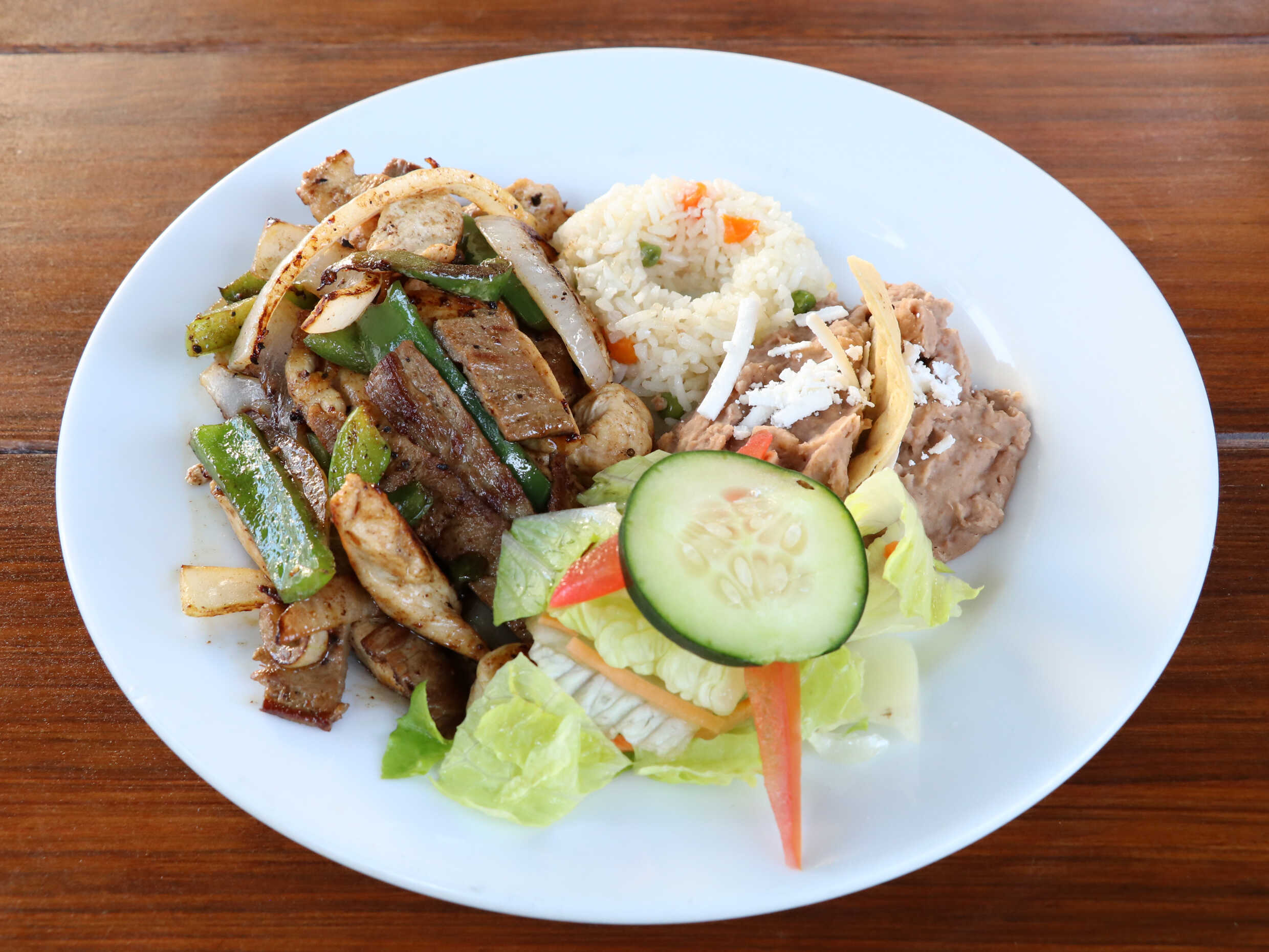 A elegir mixtas, carne o pechuga de pollo asados a la plancha, con cebolla y pimiento, acompañados de arroz y frijol.
