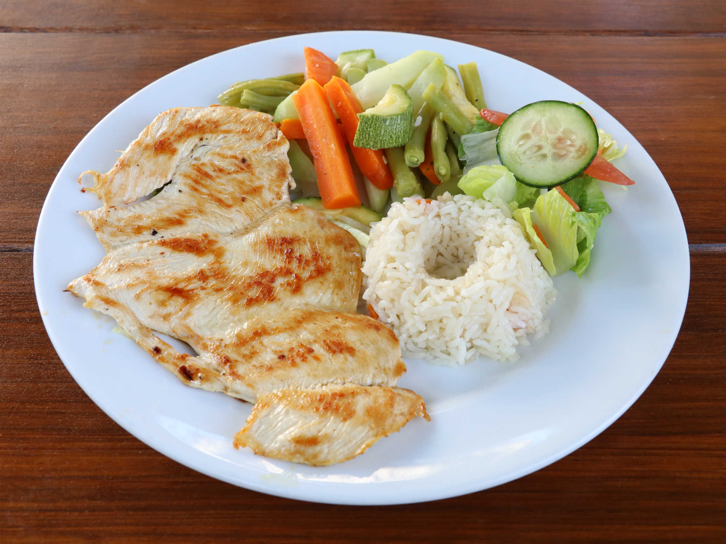 Pechuga de pollo asada o carne de res, sobre una cama de hojas y vegetales al vapor acompañadas de arroz y frijolitos.