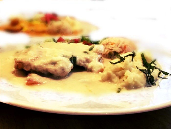 Deliciosa pechuga de pollo rellena de jamón y queso, bañada con salsa de piña de la casa, acompañada de ensalada, puré de papa.