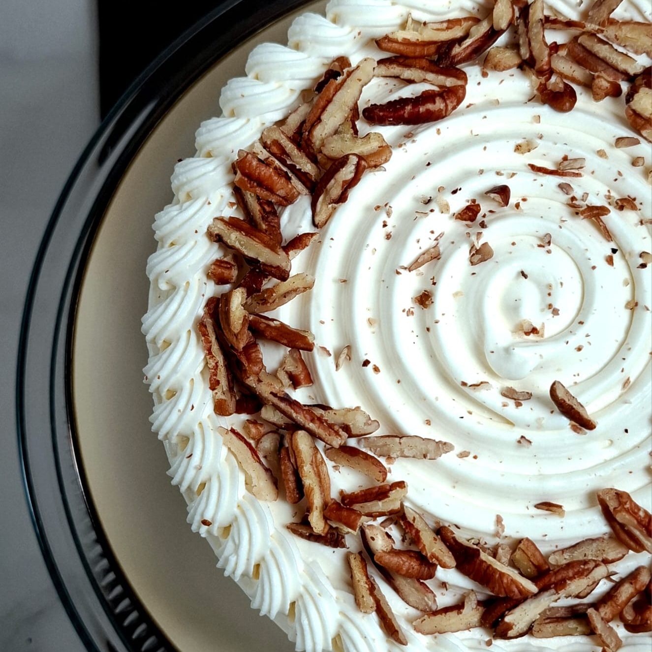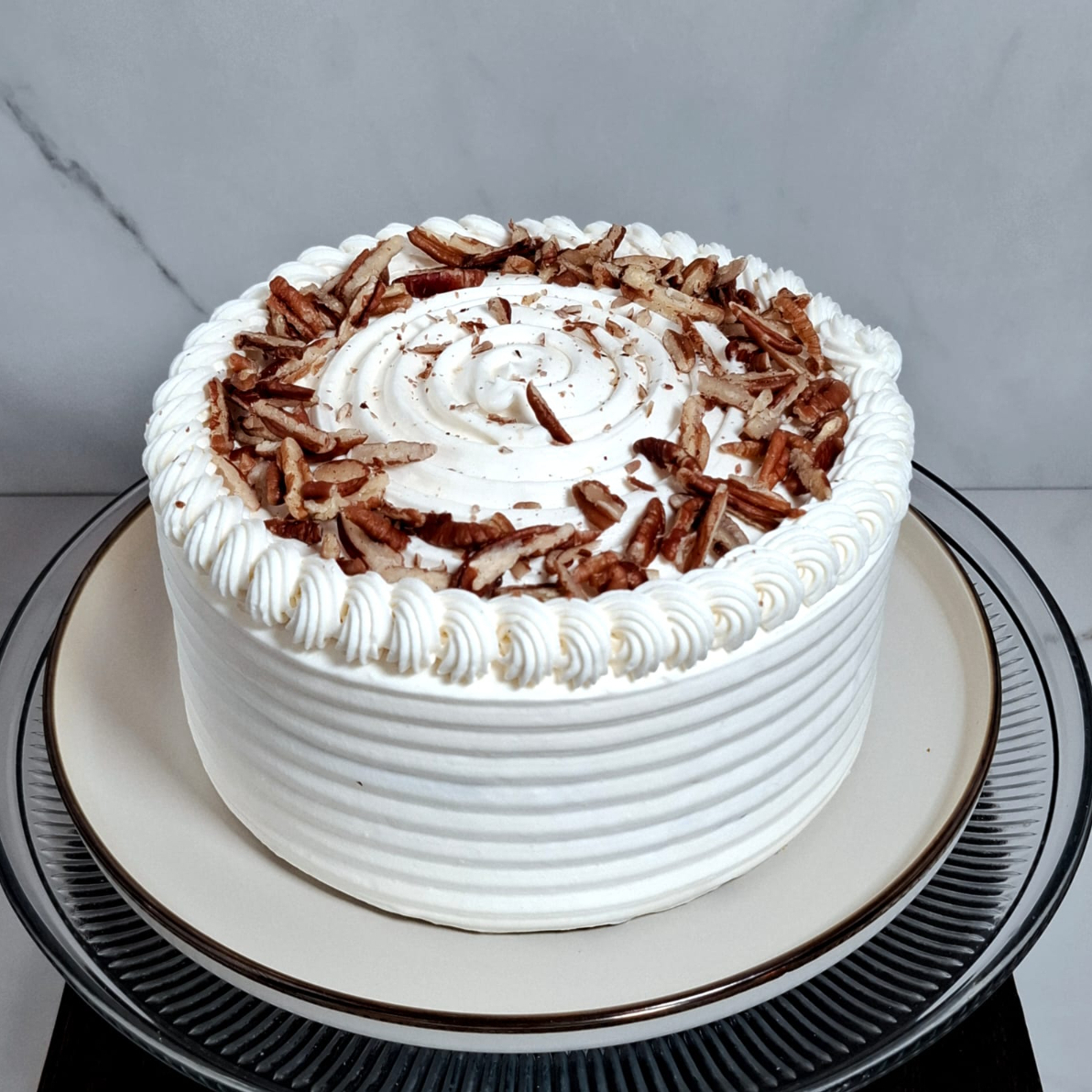 Casi 3 kg de suave y húmedo bizcocho de zanahoria con canela y nuez pecana en cuatro deliciosas capas, con triple relleno de frosting de queso philadelphia.