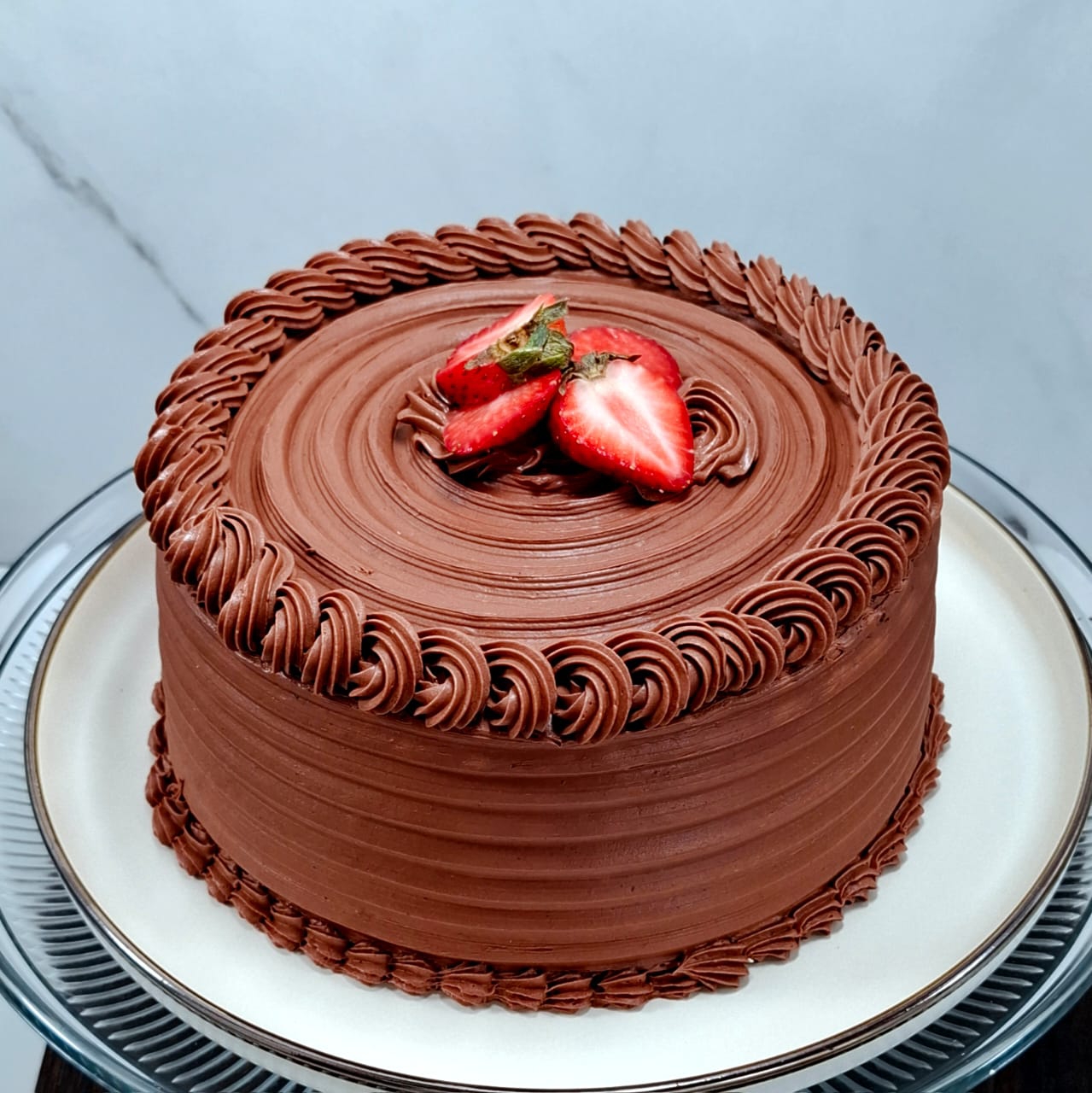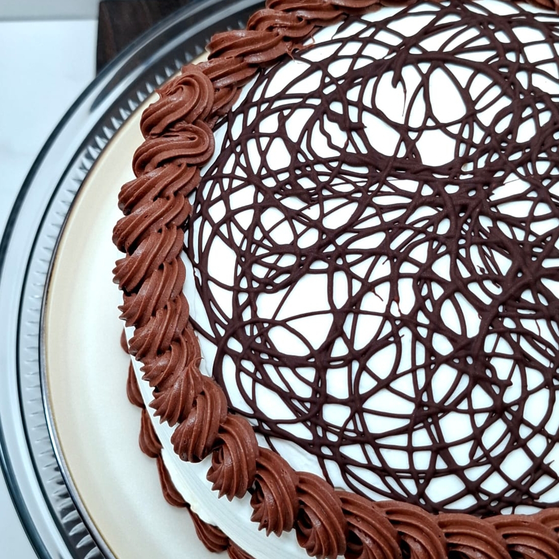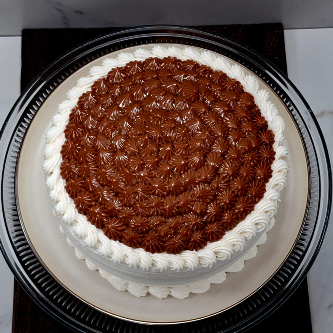 Casi 3 kg de jugoso pan de vainilla, bañado en tres leches con doble relleno de crema de chocolate, cubierto con crema chantilly de nata y topping de chocolate derretido.