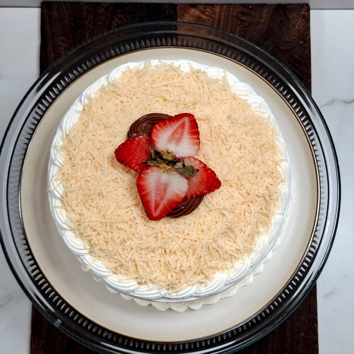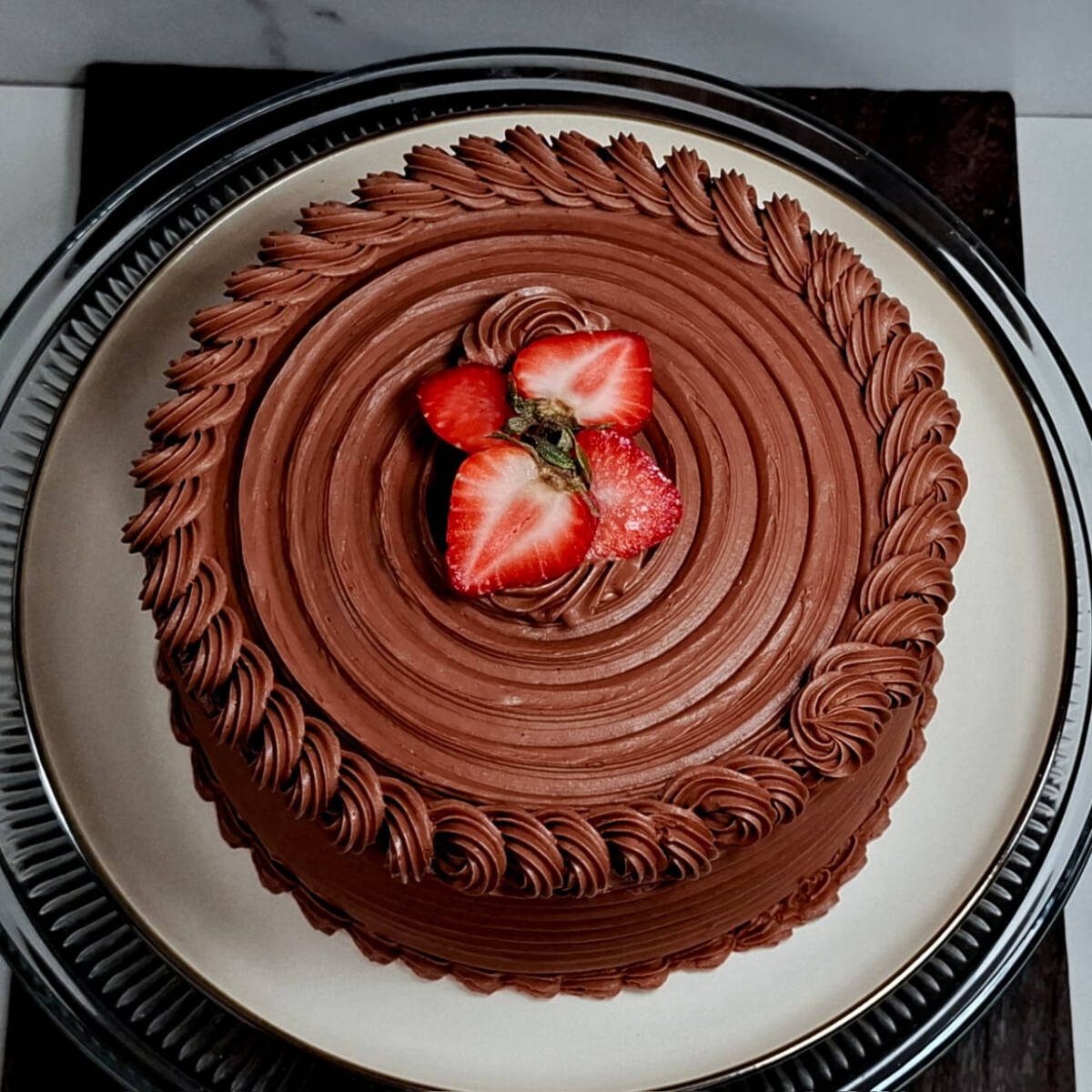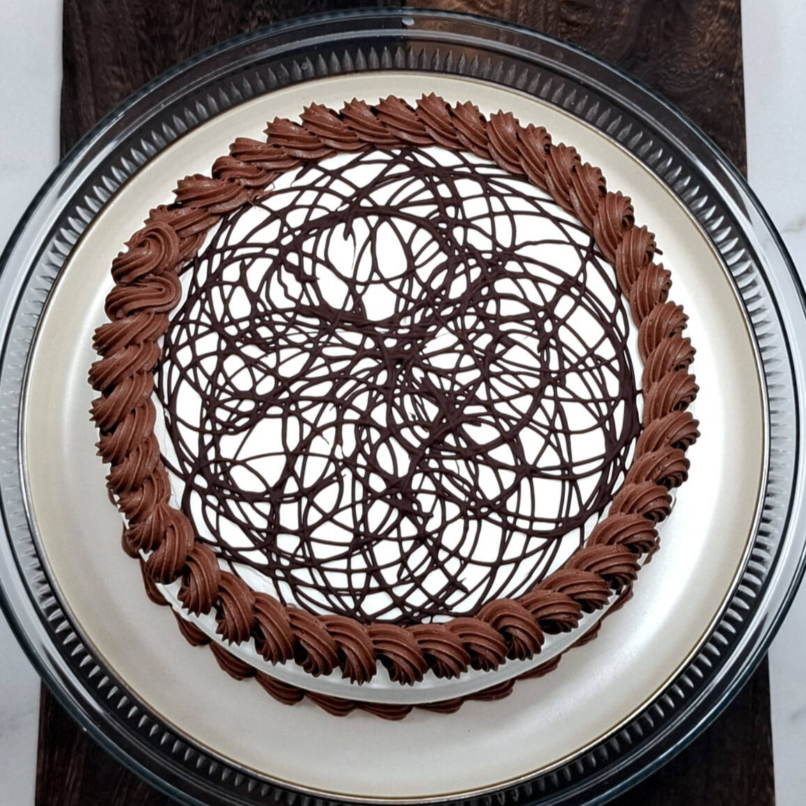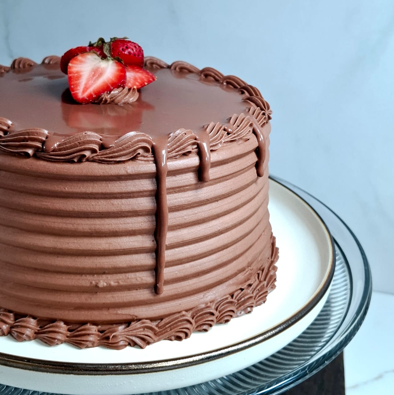 Casi 3 kg de jugoso pan de vainilla, bañado en tres leches con doble relleno de crema de chocolate, cubierto con crema chantilly de nata y topping de chocolate derretido.