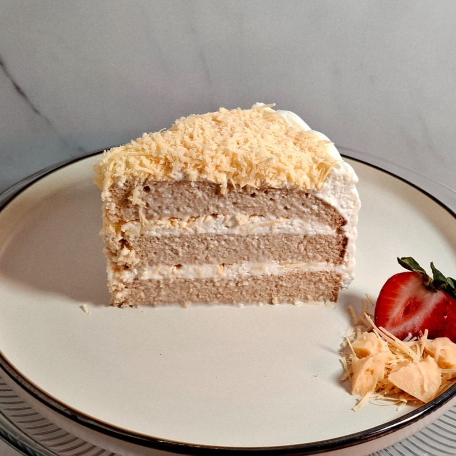 Tres capas de jugoso pan de vainilla bañado en tres leches con doble relleno de chantilly de nata con queso de bola, cubierto con una generosa capa de queso de bola de El gallo azul.