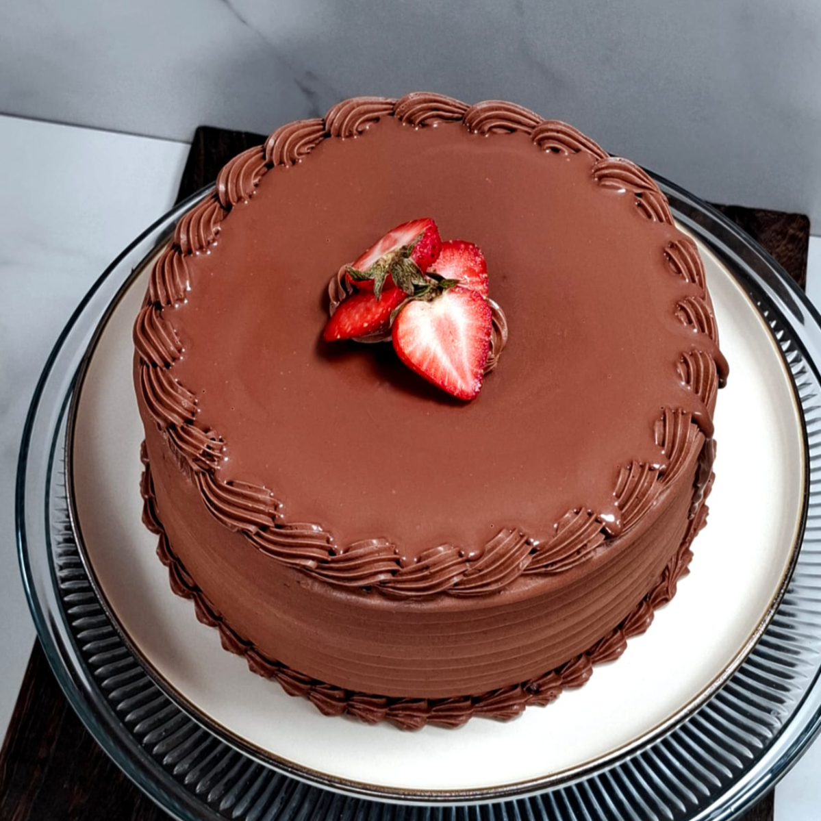 Casi 3 kg de una deliciosa combinación de bizcocho de chocolate humectado con almíbar de café, relleno de cheescake y mousse de chocolate, cubierto con delicioso ganache de chocolate oscuro.