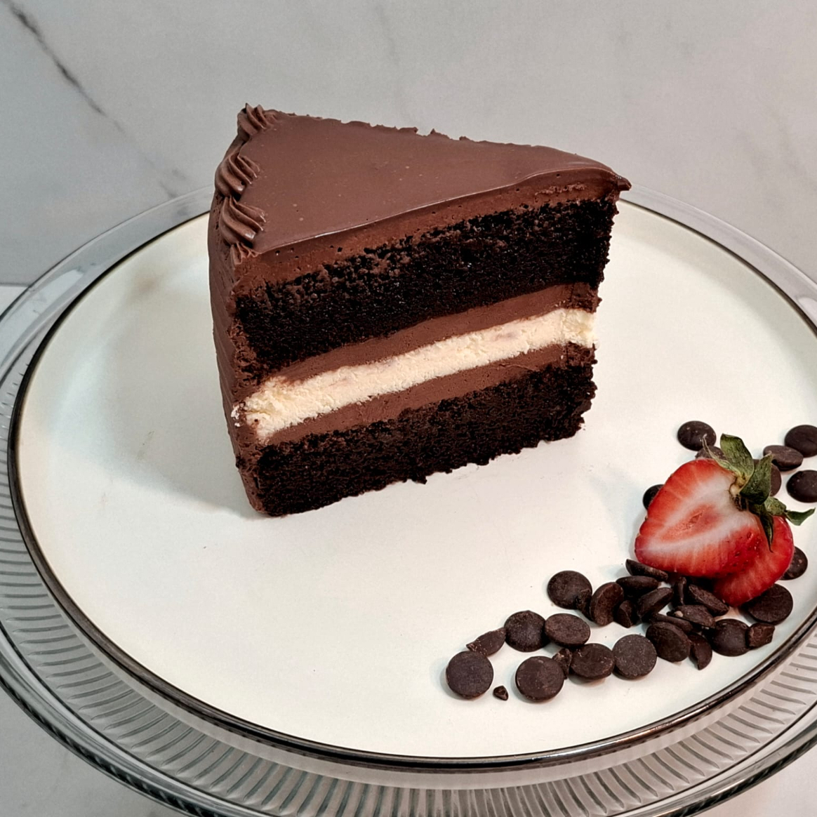 Deliciosa combinación de bizcocho de chocolate humectado con almíbar de café, relleno de cheescake y mousse de chocolate, cubierto con delicioso ganache de chocolate oscuro.