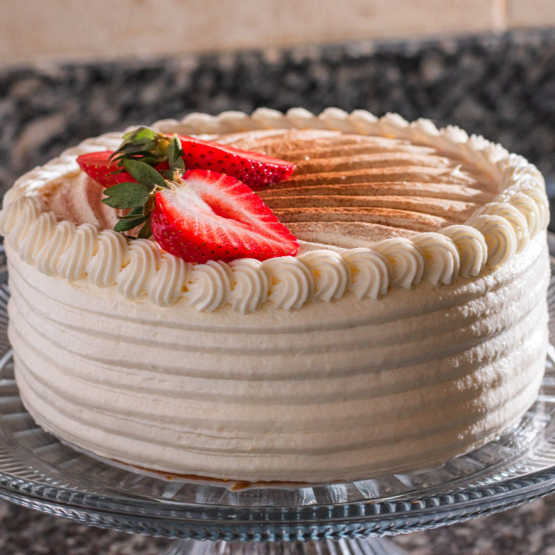 casi 3 kg de jugoso pan de vainilla bañado en tres leches con doble relleno de crema chantilly casera.