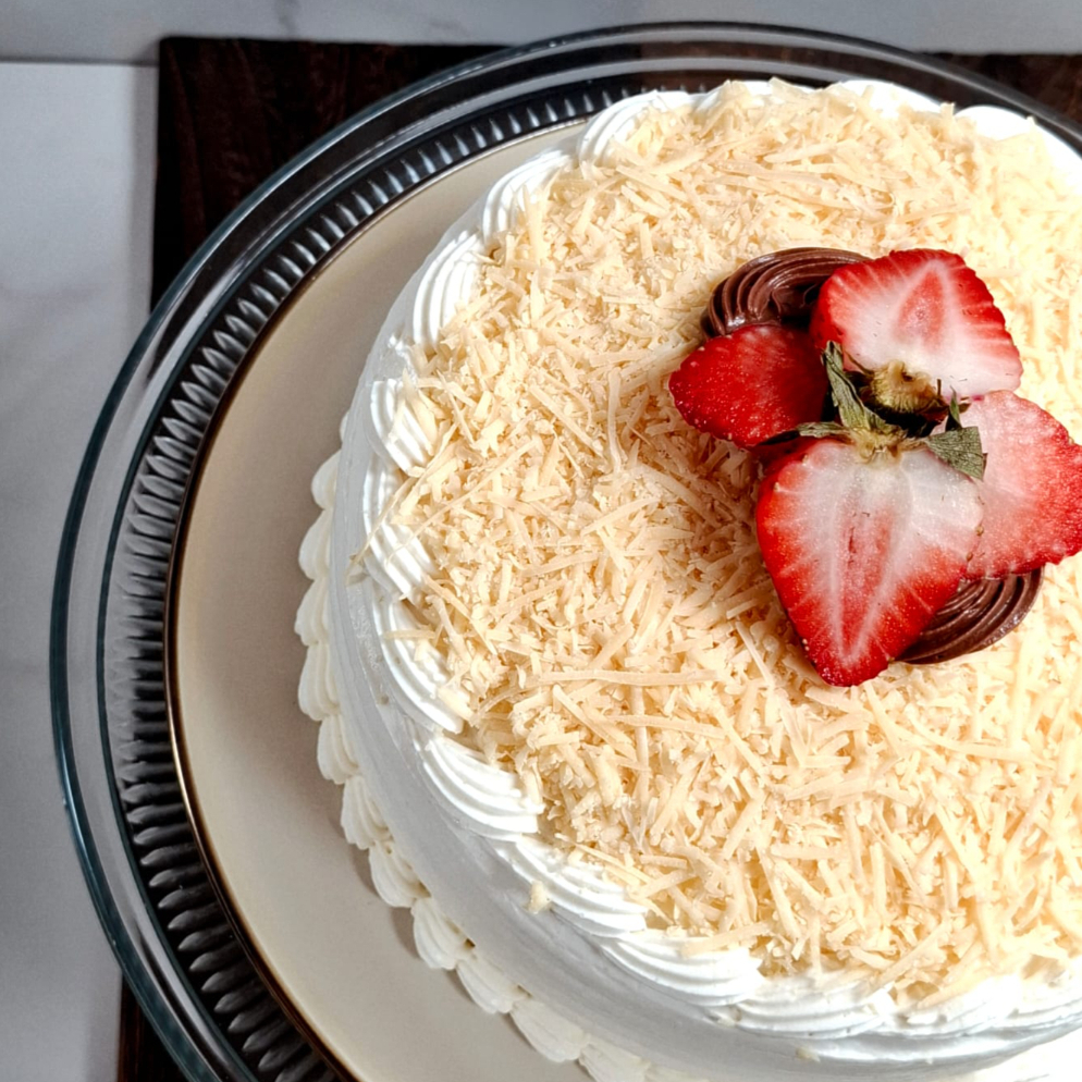 casi 3kg de jugoso pan de vainilla, bañado en tres leches con doble relleno de crema chantilly casera con queso de bola, cubierto con queso de bola de el gallo azul